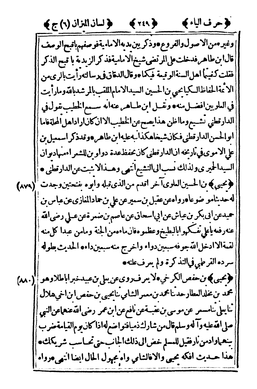 [879] " يحيى" بن الحسين العلوي آخر أقدم من الذي قبله وأبوه بفتحتين وجدت له حديثا موضوعا رواه عن عقيل بن سمير عن علي بن حماد المغازي عن عباس بن حميد عن أبي بكر بن عياش عن أبي إسحاق عن عاصم بن ضمرة عن علي رضى الله عنه رفعه يا علي تفكهوا بالبطيخ وعظموه فإن ماءه من الجنة وما من عبد أكل منه لقمه إلا أدخل الله جوفه سبعين دواء وأخرج منه سبعين داء الحديث بطوله سرده القرطبي في التذكرة ولم يعرف علته.