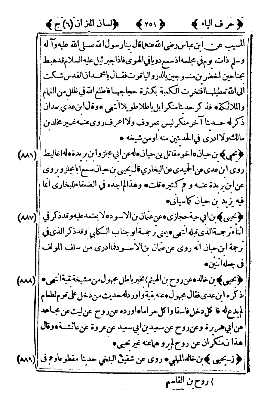 [888] "يحيى" بن خالد عن روح بن الهيثم1 بخبر باطل مجهول من مشيخة بقية انتهى ذكره ابن عدي فقال مجهول عنه بقية وأورد له حديث من دخل على قوم لطعام لم يدع له فأكل دخل فاسقا وأكل حراما أورده عن روح عن ليث عن مجاهد عن أبي هريرة وعن روح عن سعيد بن أبي سعيد عن عروة عن عائشة وقال هذان منكران عن روح لم يروهما عنه غير يحيى.