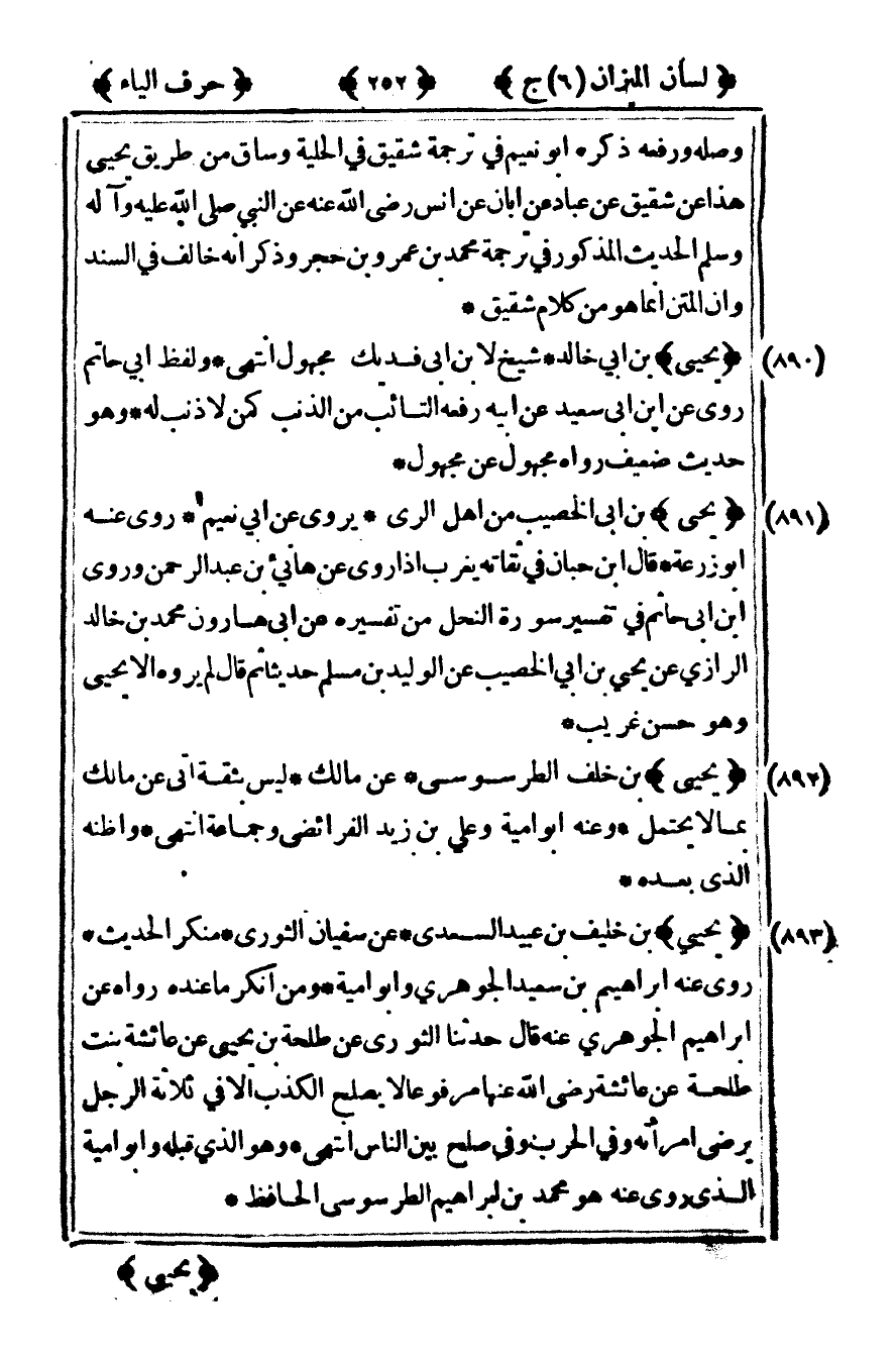[891] "يحيى" بن أبي الخصيب من أهل الري يروي عن أبي نعيم روى عنه أبو زرعة قال ابن حبان في ثقاته يغرب إذا روى عن هانئ بن عبد الرحمن وروى ابن أبي حاتم في تفسير سورة النحل من تفسيره عن أبي هارون محمد بن خالد الرازي عن يحيى بن أبي الخصيب عن الوليد بن مسلم حديثا ثم قال لم يروه إلا يحيى وهو حسن غريب.