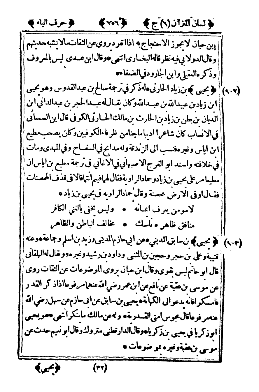 [902] "يحيى" بن زياد الحارثي له ذكر في ترجمة صالح بن عبد القدوس وهو يحيى بن زياد بن عبيد الله بن عبد الله وكان يقال له عبد الحجر بن عبد الداني بن الدي أن ابن بطن بن زياد بن الحارث بن مال الحارثي الكوفي قال ابن السمعاني في الأنساب كان شاعرا أديبا ما جنا من ظرفاء الكوفيين وكان يصحب مطيع بن إياس وغيره فنسب إلى الزندقة وله مدايح في السفاح وفي المهدي ومات في خلافته وأسند أبو الفرج الأصبهاني في الأغاني في ترجمة مطيع بن إياس أن مطيعا مر على يحيى بن زياد وحماد الراوية فقال لهما فيم أنتما قالا في قذف المحصنات فقال أوفي الأرض محصنة وقال حماد الراوية في يحيى بن زياد