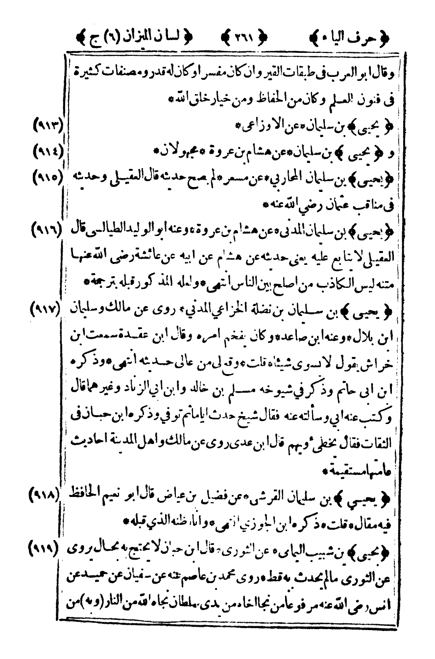 [916] يحيى بن سليمان المدني عن هشام بن عروة وعنه أبو الوليد الطيالسي قال العقيلي لا يتابع عليه يعني حديثه عن هشام عن أبيه عن عائشة رضى الله عنها متنه ليس الكاذب من أصلح بين الناس انتهى ولعله المذكور قبله بترجمة.