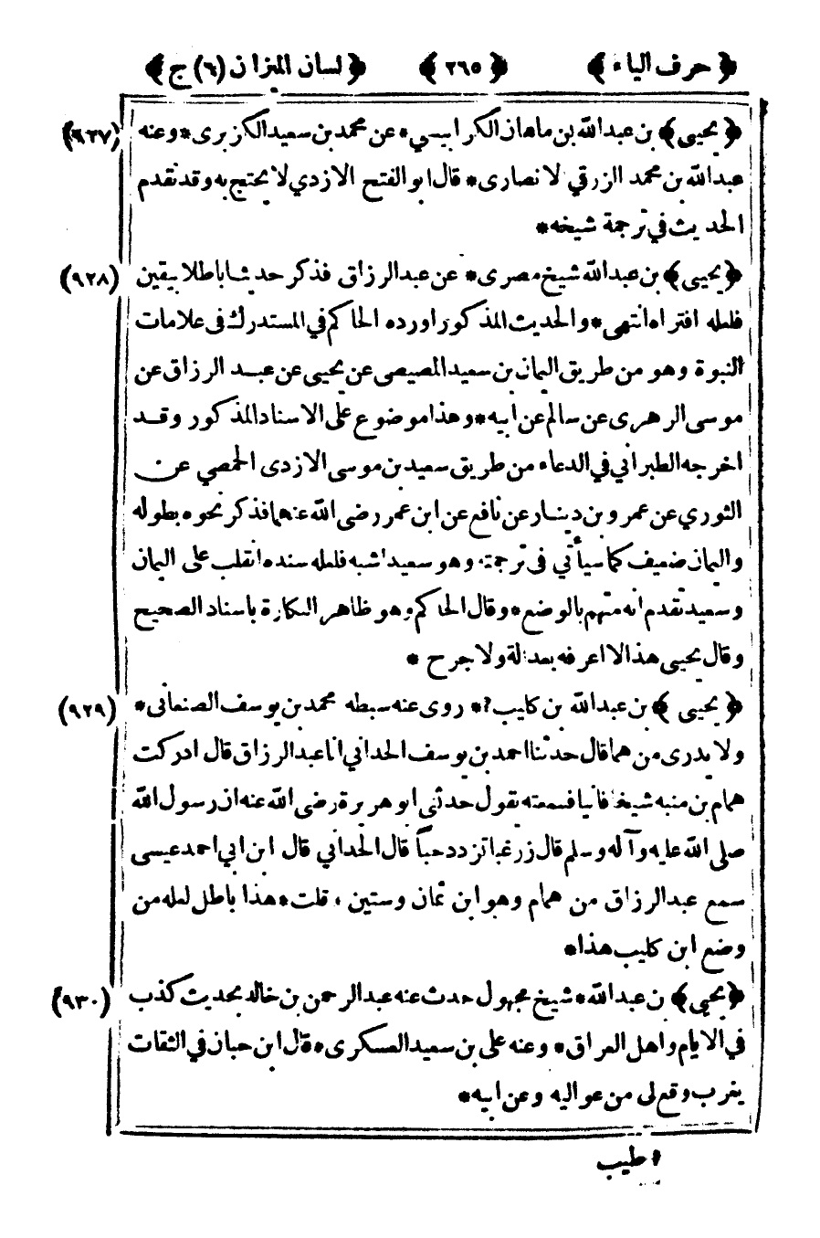 [929] "يحيى" بن عبد الله بن كليب1 روى عنه سبطه محمد بن يوسف الصنعاني ولا يدري من هما قال حدثنا أحمد بن يوسف الحداني أنا عبد الرزاق قال أدركت همام بن منبه شيخا فانيا فسمعته يقول حدثني أبو هريرة رضى الله عنه أن رسول الله صلى الله عليه وآله وسلم قال زر غبا تزدد حبا قال الحداني قال ابن أبي أحمد عيسى سمع عبد الرزاق من همام وهو ابن ثمان وستين قلت هذا باطل لعله من وضع بن كليب هذا.