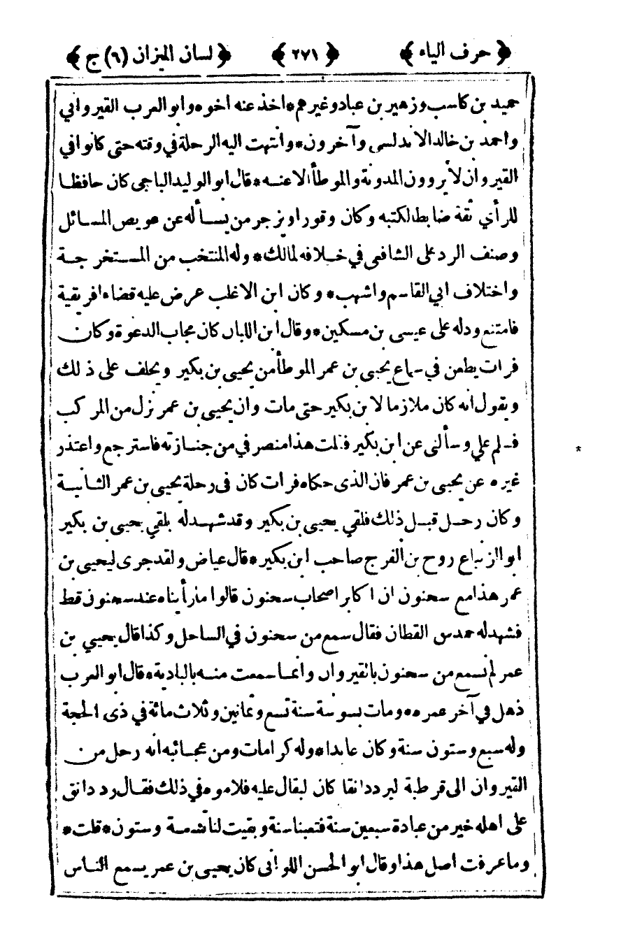 حميد بن كاسب وزهير بن عباد وغيرهم أخذ عنه أخوه وأبو العرب القيرواني وأحمد بن خالد الأندلسي وآخرون وانتهت إليه الرحلة في وقته حتى كانوا في القيروان لا يروون المدونة والموطأ إلا عنه قال أبو الوليد الباجي كان حافظا للرأي ثقة ضابطا لكتبه وكان وقورا ويزجر من يسأله عويص المسائل وصنف الرد على الشافعي في خلافه لمالك وله المنتخب من المستخرجة واختلاف أبي القاسم واشهب وك أن ابن الأغلب عرض عليه قضاء إفريقية فامتنع ودله على عيسى بن مسكين وقال ابن اللبان كان مجاب الدعوة وكان فرات يطعن في سماع يحيى بن عمر الموطأ من يحيى بن بكير ويحلف على ذلك ويقول أنه كان ملازما لابن بكير حتى مات وأن يحيى بن عمر نزل من المركب فسلم علي وسألني عن ابن بكير فقلت هذا منصرفي من جنازته فاسترجع واعتذر غيره عن يحيى بن عمر فإن الذي حكاه فرات كان في رحلة يحيى بن عمر الثانية وكان رحل قبل ذلك فلقي يحيى بن بكير وقد شهد له بلقي يحيى بن بكير أبو الزنباع روح بن الفرج صاحب بن بكير قال عياض ولقد جرى ليحيى بن عمر هذا مع سحنون أن أكابر أصحاب سحنون قالوا ما رأيناه عند سحنون قط فشهد له حمدس القطان فقال سمع من سحنون في الساحل وكذا قال يحيى بن عمر لم نسمع من سحنون بالقيروان وإنما سمعت منه بالبادية قال أبو العرب ذهل في آخر عمره ومات بسوسة سنة تسع وثمانين وثلاث مائة في ذي الحجة وله سبع وستون سنة وكان عابدا وله كرامات ومن عجائبه أنه رحل من القيروان إلى قرطبة ليرد دانقا كان لبقال عليه فلاموه في ذلك فقال رد دانق على أهله خير من عبادة سبعين سنة فتعبنا سنة وبقيت لنا تسعة وستون قلت وما عرفت أصل هذا وقال أبو الحسن اللواني كان يحيى بن عمر يسمع الناس