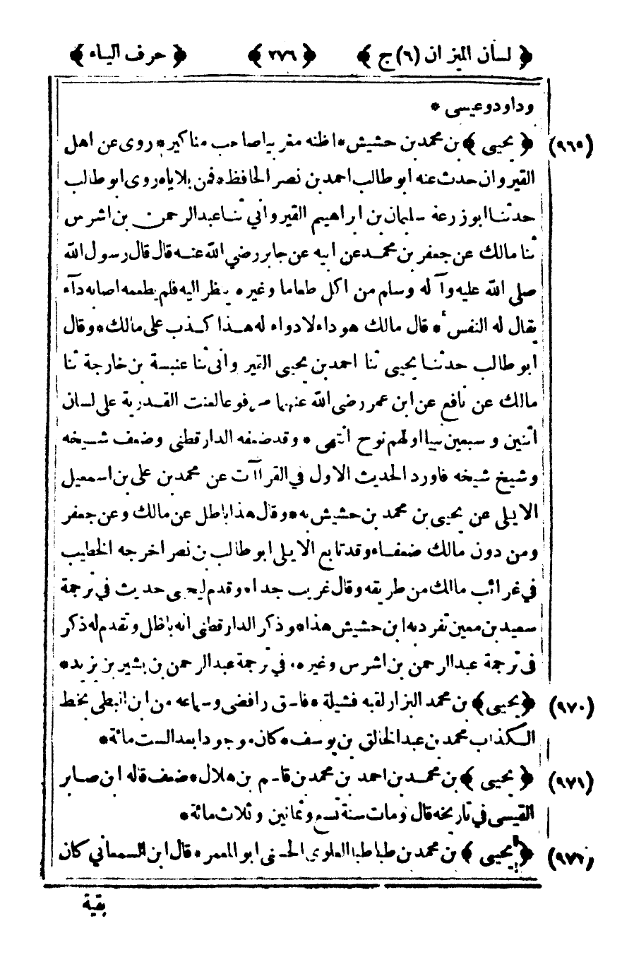 [971] "يحيى" بن محمد بن أحمد بن محمد بن قاسم بن هلال ضعفه قال ابن صابر القيسي في تاريخه قال ومات سنة تسع وثمانين وثلاث مائة.