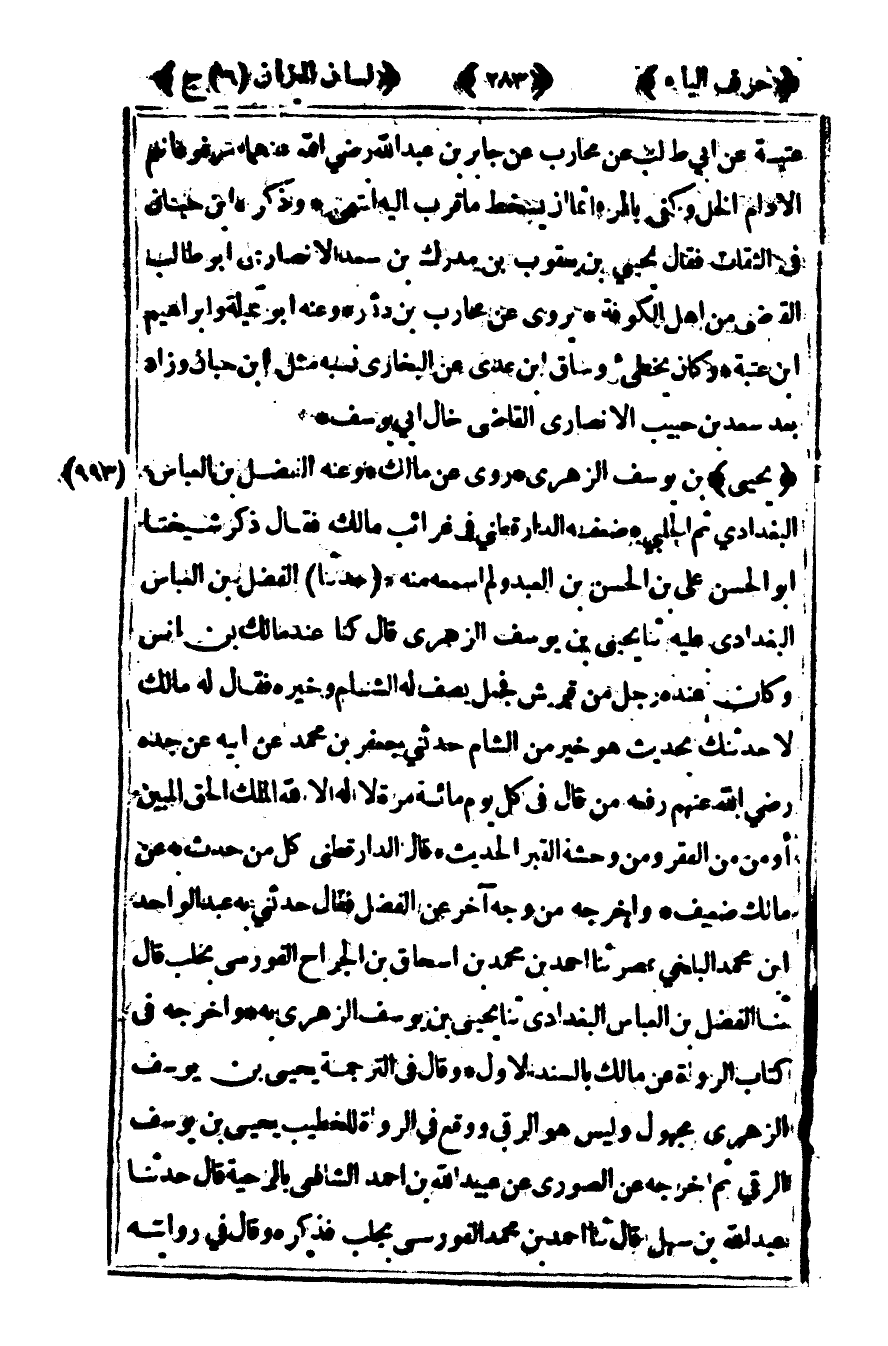 [993] "يحيى" بن يوسف الزهري روى عن مالك وعنه الفضل بن العباس البغدادي ثم الحلبي ضعفه الدارقطني في غرائب مالك فقال ذكر شيخنا أبو الحسن علي بن الحسن بن العبد ولم أسمعه منه حدثنا الفضل بن العباس البغدادي عليه ثنا يحيى بن يوسف الزهري قال كنا عند مالك بن أنس وكان عنده رجل من قريش فجعل يصف له الشام وخيره فقال له مالك لأحدثنك بحديث هو خير من الشام حدثني جعفر بن محمد عن أبيه عن جده رضى الله عنهم رفعه من قال في كل يوم مائة مرة لا إله إلا الله الملك الحق المبين أومن من الفقر ومن وحشة القبر الحديث قال الدارقطني كل من حدث به عن مالك ضعيف وأخرجه من وجه آخر عن الفضل فقال حدثني به عبد الواحد بن محمد البلخي بمصر ثنا أحمد بن محمد بن إسحاق بن الجراح الفورسي بحلب قال ثنا الفضل بن العباس البغدادي ثنا يحيى بن يوسف الزهري به وأخرجه في كتاب الرواة عن مالك بالسند الأول وقال في الترجمة يحيى بن يوسف الزهري مجهول وليس هو الرقي ووقع في الرواة للخطيب يحيى بن يوسف الرقي ثم أخرجه عن الصوري عن عبيد الله بن أحمد الشافعي بالرحية قال حدثنا عبد الله بن سهل قال ثنا أحمد بن محمد الفورسي بحلب فذكره وقال في روايته