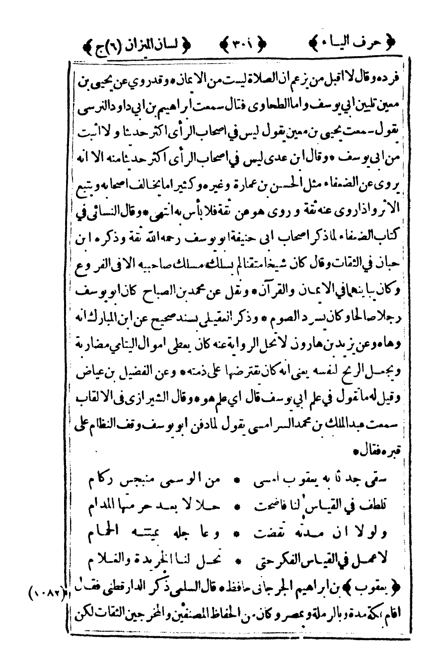 فرده وقال لا أقبل من يزعم أن الصلاة ليست من الإيمان وقد روى عن يحيى بن معين تليين أبي يوسف وأما الطحاوي فقال سمعت إبراهيم بن أبي داود النرسي يقول سمعت يحيى بن معين يقول ليس في أصحاب الرأي أكثر حديثا ولا أثبت من أبي يوسف وقال ابن عدي ليس في أصحاب الرأي أكثر حديثا منه إلا أنه يروي عن الضعفاء مثل الحسن بن عمارة وغيره وكثيرا ما يخالف أصحابه ويتبع الأثر وإذا روى عنه ثقة وروى هو عن ثقة فلا باس به انتهى وقال النسائي في كتاب الضعفاء لما ذكر أصحاب أبي حنيفة أبو يوسف رحمه الله ثقة وذكره ابن حبان في الثقات وقال كان شيخا متقنا لم يسلك مسلك صاحبيه إلا في الفروع وكان يباينهما في الإيمان والقرآن ونقل عن محمد بن الصباح كان أبو يوسف رجلا صالحا وكان يسرد الصوم وذكر العقيلي بسند صحيح عن ابن المبارك أنه وهاه وعن يزيد بن هارون لا تحل الرواية عنه كان يعطي أموال اليتامي مضاربة ويجعل الربح لنفسه يعني أنه كان يقترضها على ذمته وعن الفضيل بن عياض وقيل له ما تقول في علم أبي يوسف قال أي علم هو وقال الشيرازي في الألقاب سمعت عبد الملك بن محمد السرامسي يقول لما دفن أبو يوسف وقف النظام على قبره فقال
