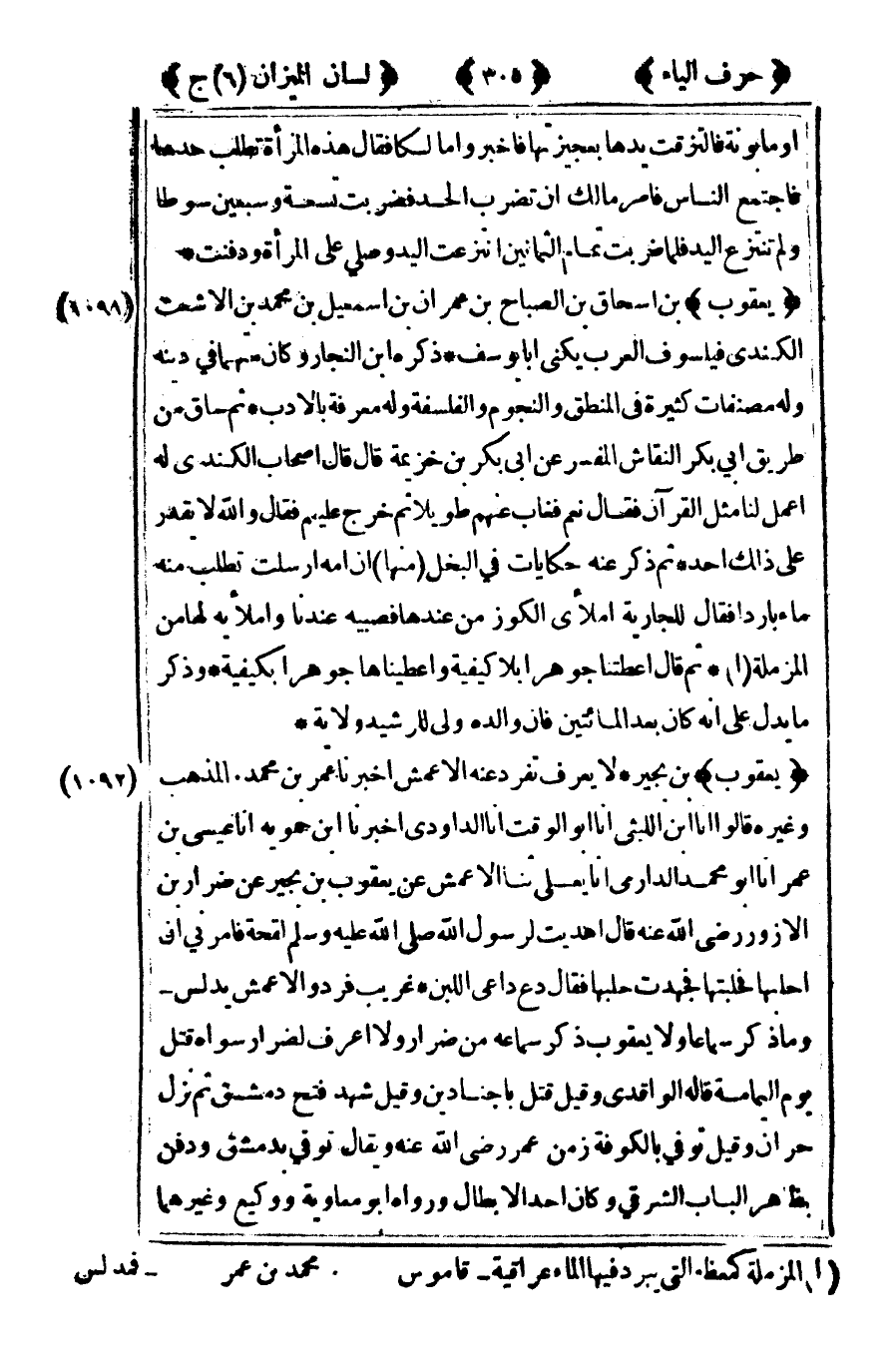 [1091] "يعقوب" بن إسحاق بن الصباح بن عمر أن ابن إسماعيل بن محمد بن الأشعث الكندي فيلسوف العرب يكنى أبا يوسف ذكره ابن النجار وكان متهما في دينه وله مصنفات كثيرة في المنطق والنجوم والفلسفة وله معرفة بالأدب ثم ساق من طريق أبي بكر النقاش المفسر عن أبي بكر بن خزيمة قال: قال أصحاب الكندي له اعمل لنا مثل القرآن فقال نعم فغاب عنهم طويلا ثم خرج عليهم فقال والله لايقدر على ذلك أحد ثم ذكر عنه حكايات في البخل منها إن أمه أرسلت تطلب منه ماء باردا فقال للجارية املأي الكوز من عندها فصبيه عندنا واملأيه لها من المزملة1 ثم قال أعطتنا جوهرا بلا كيفية وأعطيناها جوهرا بكيفية وذكر ما يدل على أنه كان بعد المائتين فإن والده ولي للرشيد ولاية.