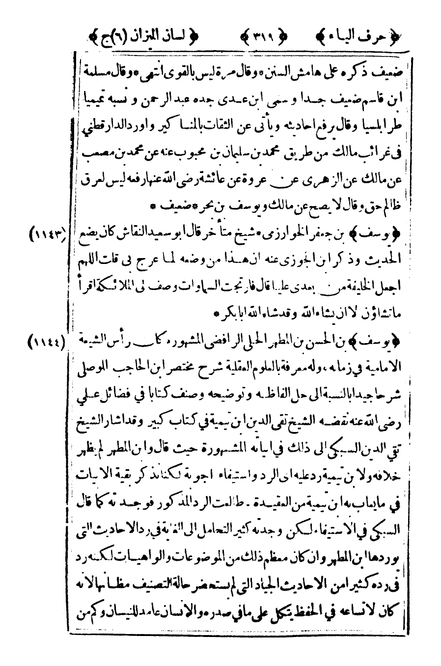 [1144] "يوسف" والد الحسن بن يوسف بن علي بن المطهر الحلي الرافضي المشهور وكان رأس الشيعة الإمامية في زمانه وله معرفة بالعلوم العقلية شرح مختصر بن الحاجب الموصلي شرحا جيد بالنسبة إلى حل الفاظة وتوضيحه وصنف كتابا في فضائل علي رضى الله عنه نقضه الشيخ تقي الدين بن تيمية في كتاب كبير وقد أشار الشيخ تقي الدين السبكي إلى ذلك في أبياته المشهورة حيث قال وابن المطهر لم يظهر خلافه ولابن تيمية رد عليه أي الرد واستيفاء أجوبة لكنا نذكر بقية الأبيات في ما يعاب به بن تيمية من العقيدة طالعت الرد المذكور فوجدته كما قال السبكي في الاستيفاء لكن وجدته كثير التحامل إلى الغاية في رد الأحاديث التي يوردها بن المطهر وان كان معظم ذلك من الموضوعات والواهيات لكنه رد في رده كثيرا من الأحاديث الجياد التي لم يستحضر حالة التصنيف مظانها لأنه كان لاتساعه في الحفظ يتكل على ما في صدره والإنسان عامد للنسيان وكم من
