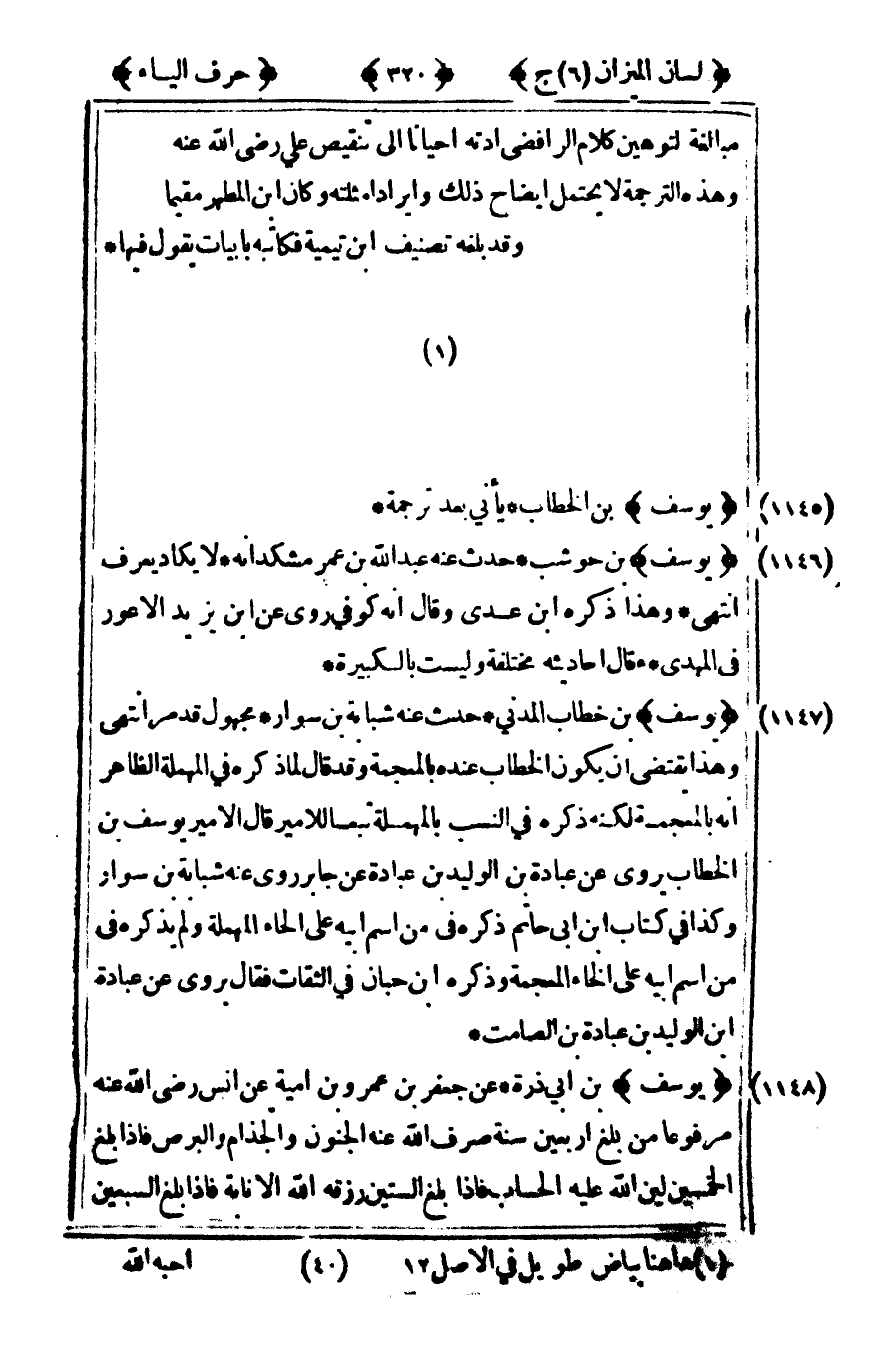 [1147] "يوسف" بن خطاب المدني حدث عنه شبابة بن سوار مجهول قد مر انتهى وهذا يقتضي أن يكون الخطاب عنده بالمعجمة وقد قال لما ذكره في المهملة الظاهر أنه بالمعجمة لكنه ذكره في النسب بالمهملة تبعا للأمير قال الأمير يوسف بن الخطاب يروي عن عبادة بن الوليد بن عبادة عن جابر روى عنه شبابة بن سوار وكذا في كتاب بن أبي حاتم ذكره في من اسم أبيه على الحاء المهملة ولم يذكره في من اسم أبيه على الخاءالمعجمة وذكره ابن حبان في الثقات فقال يروي عن عبادة بن الوليد بن عبادة بن الصامت.