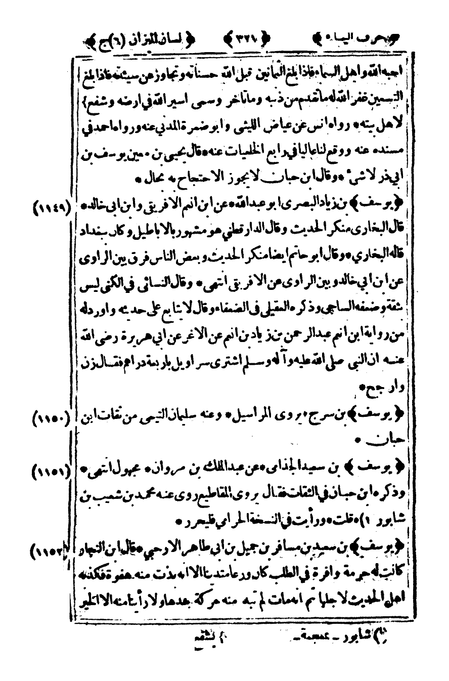 [1152] "يوسف" بن سعيد بن مسافر بن جميل بن أبي طاهر الأرحبي قال ابن النجار كانت له حرمة وافرة في الطلب كان ورعا متدينا إلا أنه بدت منه هفوة فكذبه أهل الحديث لأجلها ثم أنه مات لم تبد منه حركة بعدها ولا رأينا منه إلا الخير