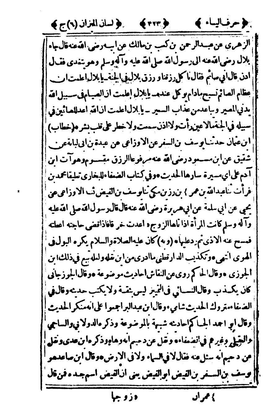الزهري عن عبد الرحمن بن كعب بن مالك عن أبيه رضى الله عنه قال جاء بلال رضى الله عنه إلى رسول الله صلى الله عليه وآله وسلم وهو يتغدى فقال ادن قال أبي صائم فقال نأكل رزقنا ورزق بلال في الجنة يا بلال أعلمت أن عظام الصائم تسبح ما دام يوكل عنده يا بلال أعلمت أن الصيام في سبيل الله يدني المصير ويباعد من عذاب السعير يا بلال أعلمت أن الله أعد للصائمين في سبيله في الجنة ما لا عين رأت ولا أذن سمعت ولا خطر على قلب بشر خطاب بن عثمان حدثنا يوسف بن السفر عن الأوزاعي عن عبدة بن أبي لبابة عن شقيق عن ابن مسعود رضى الله عنه مرفوعا الرزق مقسوم وهو آت بن آدم على أي مسيرة سارها الحديث وفي كتاب الضعفاء للبخاري تعليقا محمد بن فرات ثنا عبد الله بن عمر1 بن رزين مكي ثنا يوسف بن الفيض ثنا الأوزاعي عن يحيى عن أبي سلمة عن أبي هريرة رضى الله عنه قال: قال رسول الله صلى الله عليه وآله وسلم كانت المرأة إذا أتاها الزوج2 أدت خرقا فإذا قضى حاجته أعطته فمسح عنه الأذى ثم رد عليها وبه كان صلى الله عليه وآله وسلم يكره البول في الهوى انتهى وتكذيب الدارقطني ما أدري من أين نقله ولعله تبع في ذلك بن الجوزي وقال الحاكم روى عن النقاش أحاديث موضوعة وقال الجوزجاني كان يكذب وقال النسائي في التمييز ليس بثقة ولا يكتب حديثه وقال في الضعفاء متروك الحديث شامي وقال ابن عبد البر أجمعوا على أنه منكر الحديث وقال أبو أحمد الحاكم أحاديثه شبيهة بالموضوعة وذكره الدولابي والساجي والعقيلي وغيرهم في الضعفاء ونقل عن دحيم أنه وهاه وذكره ابن عدي ونقل عن دحيم أنه سئل عنه فقال لا في السماء ولا في الأرض وقال ابن صاعد هو يوسف بن السفر بن الفيض أبو الفيض يعني أن الفيض اسم جده فمن قال