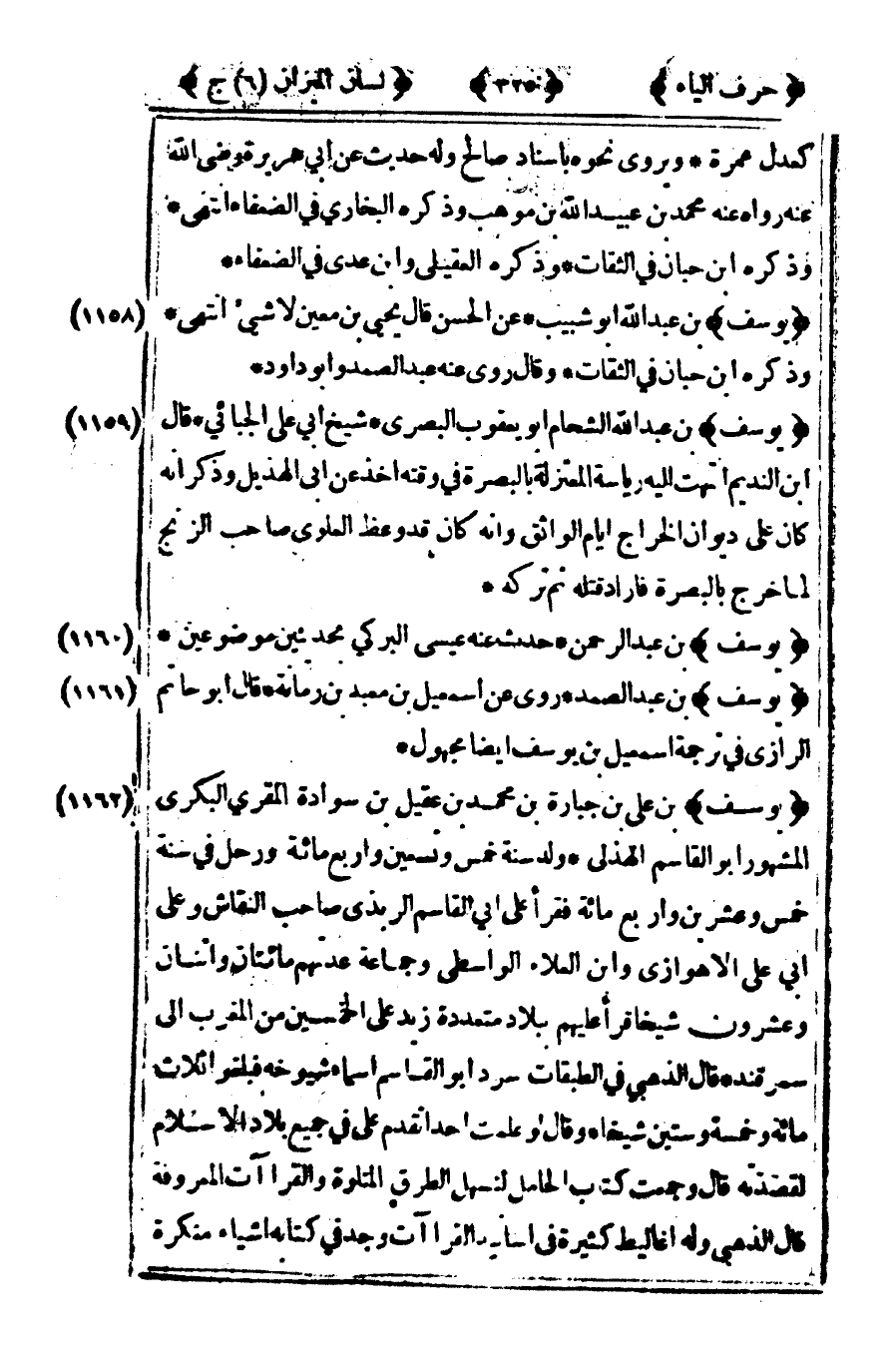 [1160] "يوسف" بن عبد الرحمن حدث عنه عيسى البركي بحديثين موضوعين.