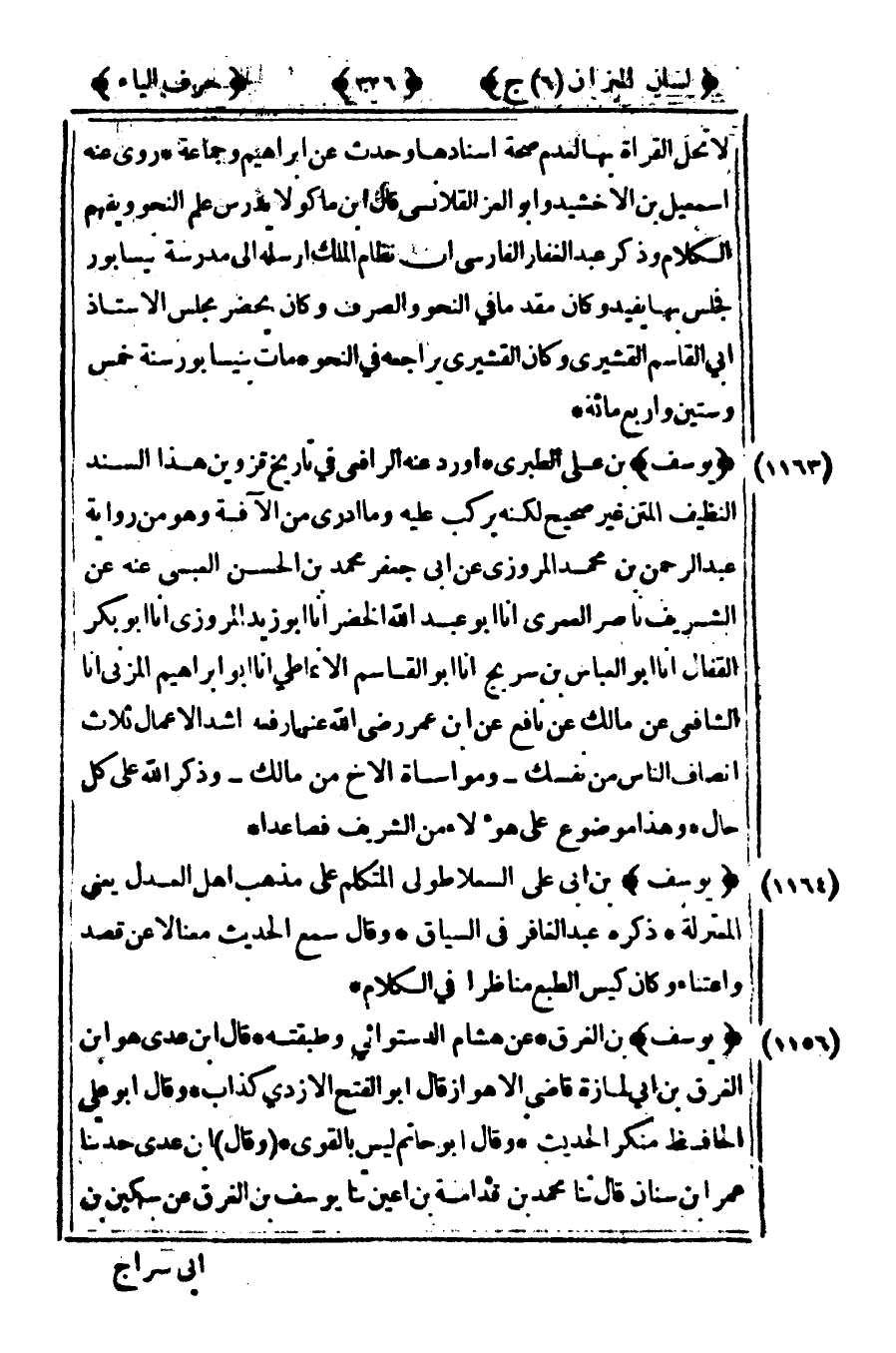 [1164] "يوسف" بن أبي علي السعلاطولي المتكلم على مذهب أهل العدل يعني المعتزلة ذكره عبد الغافر في السياق وقال سمع الحديث معنا لا عن قصد واعتناء وكان كيس الطبع مناظرا في الكلام.