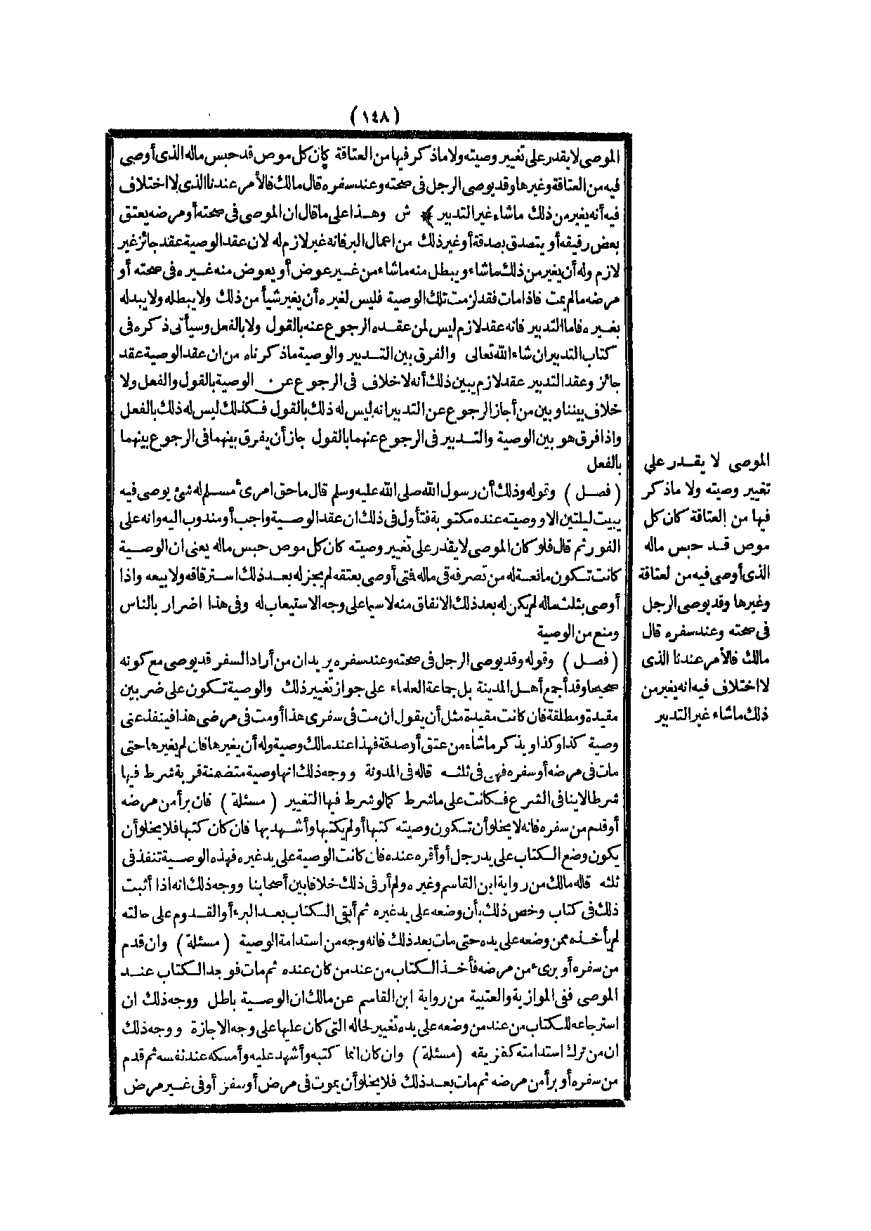 وَقَوْلُهُ، وَذَلِكَ أَنَّ رَسُولَ اللَّهِ - صَلَّى اللَّهُ عَلَيْهِ وَسَلَّمَ - قَالَ «مَا حَقُّ امْرِئٍ مُسْلِمٍ لَهُ شَيْءٌ يُوصَى فِيهِ يَبِيتُ لَيْلَتَيْنِ إلَّا وَوَصِيَّتُهُ عِنْدَهُ مَكْتُوبَةٌ» فَتَأَوَّلَ فِي ذَلِكَ أَنَّ عَقْدَ الْوَصِيَّةِ وَاجِبٌ، أَوْ مَنْدُوبٌ إلَيْهِ وَأَنَّهُ عَلَى الْفَوْرِ ثُمَّ قَالَ فَلَوْ كَانَ الْمُوصِي لَا يَقْدِرُ عَلَى تَغْيِيرِ وَصِيَّتِهِ كَانَ كُلُّ مُوصٍ حَبَسَ مَالَهُ يَعْنِي أَنَّ الْوَصِيَّةَ كَانَتْ تَكُونُ مَانِعَةً لَهُ مِنْ تَصَرُّفِهِ فِي مَالِهِ فَمَتَى أَوْصَى بِعِتْقِهِ لَمْ يَجُزْ لَهُ بَعْدَ ذَلِكَ اسْتِرْقَاقُهُ وَلَا بَيْعُهُ وَإِذَا أَوْصَى بِثُلُثِ مَالِهِ لَمْ يَكُنْ لَهُ بَعْدَ ذَلِكَ الْإِنْفَاقُ مِنْهُ لَا سِيَّمَا عَلَى وَجْهِ الِاسْتِيعَابِ لَهُ وَفِي هَذَا إضْرَارٌ بِالنَّاسِ وَمَنْعٌ مِنْ الْوَصِيَّةِ.