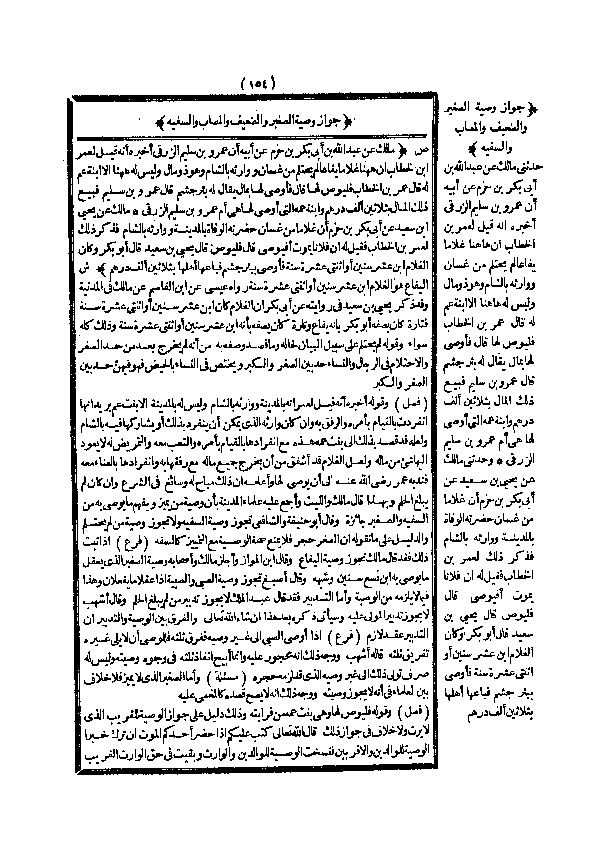 جَوَازُ وَصِيَّةِ الصَّغِيرِ وَالضَّعِيفِ وَالْمُصَابِ وَالسَّفِيهِ (ص) : (مَالِكٌ عَنْ عَبْدِ اللَّهِ بْنِ أَبِي بَكْرِ بْنِ حَزْمٍ عَنْ أَبِيهِ أَنَّ عَمْرَو بْنَ سُلَيْمٍ الزُّرَقِيَّ أَخْبَرَهُ أَنَّهُ قِيلَ لِعُمَرَ بْنِ الْخَطَّابِ أَنَّ هَاهُنَا غُلَامًا يَفَاعًا لَمْ يَحْتَلِمْ مِنْ غَسَّانَ وَوَارِثُهُ بِالشَّامِّ وَهُوَ ذُو مَالٍ وَلَيْسَ لَهُ هَاهُنَا إلَّا ابْنَةُ عَمٍّ لَهُ قَالَ عُمَرُ بْنُ الْخَطَّابِ فَلْيُوصِ لَهَا قَالَ فَأَوْصَى لَهَا بِمَالٍ يُقَالُ لَهُ بِئْرُ جُشَمَ، قَالَ عَمْرُو بْنُ سُلَيْمٍ فَبِيعَ ذَلِكَ الْمَالُ بِثَلَاثِينَ أَلْفَ دِرْهَمٍ وَابْنَةُ عَمِّهِ الَّتِي أَوْصَى لَهَا هِيَ أُمُّ عَمْرِو بْنِ سُلَيْمٍ الزُّرَقِيِّ.