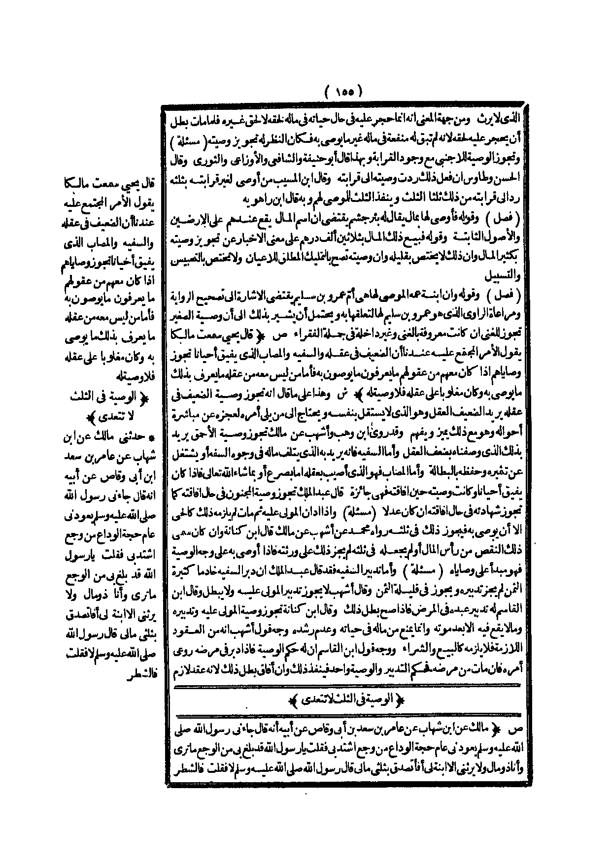 الْوَصِيَّةُ فِي الثُّلُثِ لَا تَتَعَدَّى (ص) : (مَالِكٌ عَنْ ابْنِ شِهَابٍ «عَنْ عَامِرِ بْنِ سَعْدِ بْنِ أَبِي وَقَّاصٍ عَنْ أَبِيهِ أَنَّهُ قَالَ جَاءَنِي رَسُولُ اللَّهِ - صَلَّى اللَّهُ عَلَيْهِ وَسَلَّمَ - يَعُودنِي عَامَ حَجَّةِ الْوَدَاعِ مِنْ وَجَعٍ اشْتَدَّ بِي فَقُلْت يَا رَسُولَ اللَّهِ: قَدْ بَلَغَ بِي مِنْ الْوَجَعِ مَا تَرَى وَأَنَا ذُو مَالٍ وَلَا يَرِثُنِي إلَّا ابْنَةٌ لِي أَفَأَتَصَدَّقُ بِثُلُثَيْ مَالِي قَالَ رَسُولُ اللَّهِ - صَلَّى اللَّهُ عَلَيْهِ وَسَلَّمَ - لَا فَقُلْت فَالشَّطْرُ