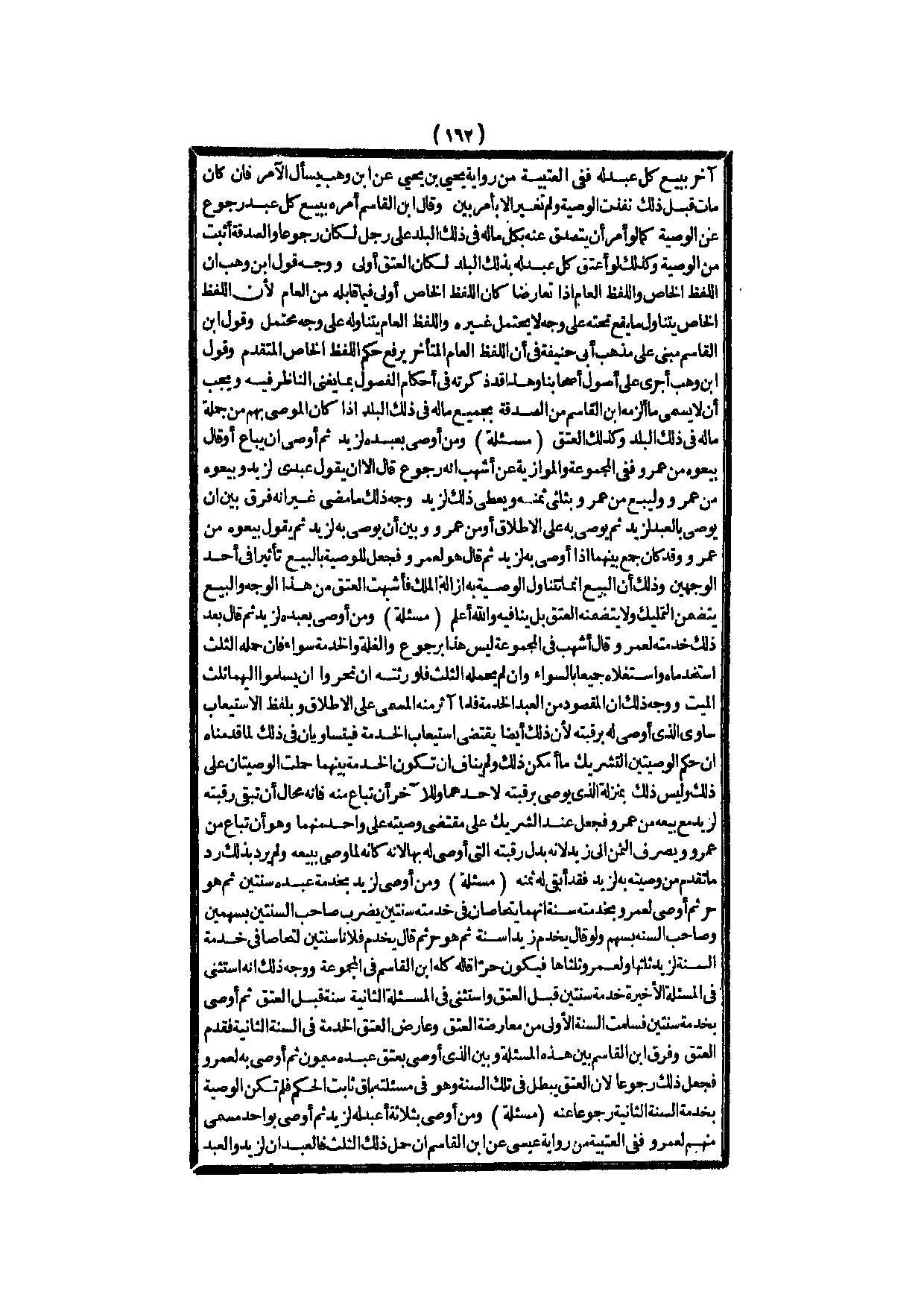 وَقَالَ ابْنُ الْقَاسِمِ أَمْرُهُ بِبَيْعِ كُلِّ عَبْدٍ رُجُوعٌ عَنْ الْوَصِيَّةِ كَمَا لَوْ أَمَرَ أَنْ يَتَصَدَّقَ عَنْهُ بِكُلِّ مَالِهِ فِي ذَلِكَ الْبَلَدِ عَلَى رَجُلٍ لَكَانَ رُجُوعًا وَالصَّدَقَةُ أَثْبَتُ مِنْ الْوَصِيَّةِ، وَكَذَلِكَ لَوْ أَعْتَقَ كُلَّ عَبْدٍ لَهُ بِذَلِكَ الْبَلَدِ لَكَانَ الْعِتْقُ أَوْلَى، وَوَجْهُ قَوْلِ ابْنِ وَهْبٍ أَنَّ اللَّفْظَ الْخَاصَّ وَاللَّفْظَ الْعَامَّ إذَا تَعَارَضَا كَانَ اللَّفْظُ الْخَاصُّ أَوْلَى فِيمَا قَابَلَهُ مِنْ الْعَامِّ؛ لِأَنَّ اللَّفْظَ الْخَاصَّ يَتَنَاوَلُ مَا يَقَعُ تَحْتَهُ عَلَى وَجْهٍ لَا يَحْتَمِلُ غَيْرَهُ وَاللَّفْظُ الْعَامُّ يَتَنَاوَلُهُ عَلَى وَجْهٍ مُحْتَمِلٍ، وَقَوْلُ ابْنِ الْقَاسِمِ مَبْنِيٌّ عَلَى مَذْهَبِ أَبِي حَنِيفَةَ فِي أَنَّ اللَّفْظَ الْعَامَّ الْمُتَأَخِّرَ يَرْفَعُ حُكْمَ اللَّفْظِ الْخَاصِّ الْمُتَقَدِّمِ، وَقَوْلُ ابْنُ وَهْبٍ أَجْرَى عَلَى أُصُولِ أَصْحَابِنَا، وَهَذَا قَدْ ذَكَرْته فِي أَحْكَامِ الْفُصُولِ بِمَا يُغْنِي النَّاظِرَ فِيهِ وَيَجِبُ أَنْ لَا يُسَمِّيَ مَا أَلْزَمُهُ ابْنُ الْقَاسِمِ مِنْ الصَّدَقَةِ بِجَمِيعِ مَالِهِ فِي ذَلِكَ الْبَلَدِ إذَا كَانَ الْمُوصَى بِهِمْ مِنْ جُمْلَةِ مَالِهِ فِي ذَلِكَ الْبَلَدِ، وَكَذَلِكَ الْعِتْقُ.