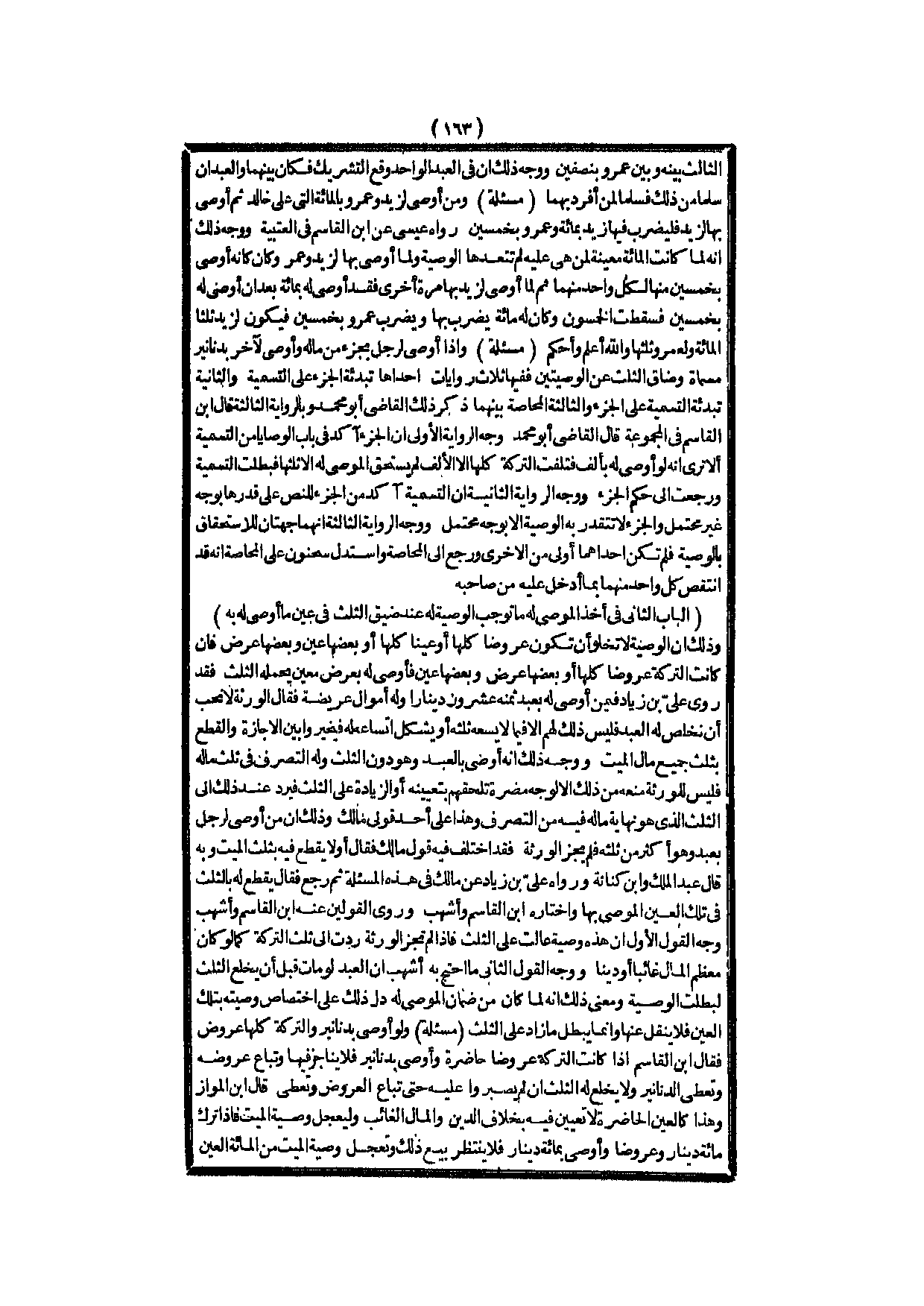 (الْبَابُ الثَّانِي فِي أَخْذِ الْمُوصَى لَهُ مَا تُوجِبُ الْوَصِيَّةُ لَهُ عِنْدَ ضِيقِ الثُّلُثِ فِي عَيْنِ مَا أُوصِيَ لَهُ بِهِ) وَذَلِكَ أَنَّ الْوَصِيَّةَ لَا تَخْلُو أَنْ تَكُونَ عُرُوضًا كُلَّهَا، أَوْ عَيْنًا كُلَّهَا، أَوْ بَعْضَهَا عَيْنٌ وَبَعْضَهَا عَرْضٌ فَإِنْ كَانَتْ التَّرِكَةُ عُرُوضًا كُلَّهَا، أَوْ بَعْضَهَا عَرْضٌ وَبَعْضَهَا عَيْنٌ فَأَوْصَى لَهُ بِعَرْضٍ مُعَيَّنٍ يَحْمِلُهُ الثُّلُثُ فَقَدْ رَوَى عَلِيُّ بْنُ زِيَادٍ فِيمَنْ أُوصِيَ لَهُ بِعَبْدٍ ثَمَنُهُ عِشْرُونَ دِينَارًا وَلَهُ أَمْوَالٌ عَرِيضَةٌ فَقَالَ الْوَرَثَةُ لَا نُحِبُّ أَنْ نُخَلِّصَ لَهُ الْعَبْدَ فَلَيْسَ ذَلِكَ لَهُمْ إلَّا فِيمَا لَا يَسَعُهُ ثُلُثُهُ، أَوْ يُشْكِلُ اتِّسَاعُهُ لَهُ فَيُخَيَّرُوا بَيْنَ الْإِجَازَةِ وَالْقَطْعِ بِثُلُثِ جَمِيعِ مَالِ الْمَيِّتِ، وَوَجْهُ ذَلِكَ أَنَّهُ أَوْصَى بِالْعَبْدِ وَهُوَ دُونَ الثُّلُثِ وَلَهُ التَّصَرُّفُ فِي ثُلُثِ مَالِهِ فَلَيْسَ لِلْوَرَثَةِ مَنْعُهُ مِنْ ذَلِكَ إلَّا لِوَجْهِ مَضَرَّةٍ تَلْحَقُهُمْ بِتَعْيِينِهِ، أَوْ الزِّيَادَةُ عَلَى الثُّلُثِ فَيَرُدُّ عِنْدَ ذَلِكَ إلَى الثُّلُثِ الَّذِي هُوَ نِهَايَةُ مَالِهِ فِيهِ مِنْ التَّصَرُّفِ.