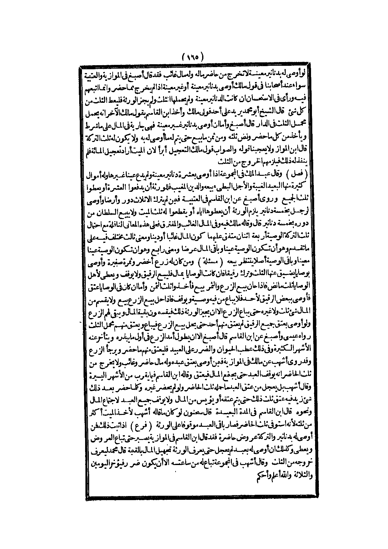 وَقَالَ عَبْدُ الْمَلِكِ فِي الْمَجْمُوعَةِ إذَا أَوْصَى بِعَشَرَةِ دَنَانِيرَ مُعَيَّنَةٍ وَلَمْ يَدَعْ عَيْنًا غَيْرَهَا وَلَهُ أَمْوَالٌ كَثِيرَةٌ مِنْهَا الْبَعِيدُ الْغَيْبَةِ وَالْأَجَلُ الْبَطِيءُ بَيْعُهُ وَالدَّيْنُ الْمُغَيَّبُ فَلِلْوَرَثَةِ أَنْ يَدْفَعُوا الْعَشَرَةَ، أَوْ يُعْطُوا ثُلُثَ الْجَمِيعِ وَرَوَى أَصْبَغُ عَنْ ابْنِ الْقَاسِمِ فِي الْعُتْبِيَّةِ فِيمَنْ لَمْ يَتْرُكْ إلَّا ثَلَاثَ دُورٍ وَأَرْضًا وَأَوْصَى لِرَجُلٍ بِخَمْسَةِ دَنَانِيرَ يَلْزَمُ الْوَرَثَةَ أَنْ يُعْطُوهَا إيَّاهُ، أَوْ يَقْطَعُوا لَهُ ثُلُثَ الْمَيِّتِ وَلَا يَبِيعَ السُّلْطَانُ مِنْ دُورِهِ بِخَمْسَةِ دَنَانِيرَ قَالَ وَقَالَهُ مَالِكٌ فِيهِ وَفِي الْمَالِ الْغَائِبِ وَالْمُفْتَرِقِ فَعَلَى هَذِهِ الْمَعَانِي النَّاقِلَةِ مَعَ احْتِمَالِ ثُلُثِ التَّرِكَةِ الْوَصِيَّةُ أَرْبَعَةٌ اثْنَانِ مُتَّفَقٌ عَلَيْهِمَا كَوْنُ الْمَالِ غَائِبًا، أَوْ دَيْنًا وَمَعْنًى ثَالِثُ مُخْتَلَفٌ فِيهِ عَلَى مَا تَقَدَّمَ وَهُوَ أَنْ تَكُونَ الْوَصِيَّةُ عَيْنًا وَبَاقِي الْمَالِ عَرَضًا وَمَعْنًى رَابِعٌ وَهُوَ أَنْ تَكُونَ الْوَصِيَّةُ عَيْنًا مُعَيَّنًا وَبَاقِي الْوَصِيَّةِ أَصْلًا يُنْتَظَرُ بَيْعُهُ.