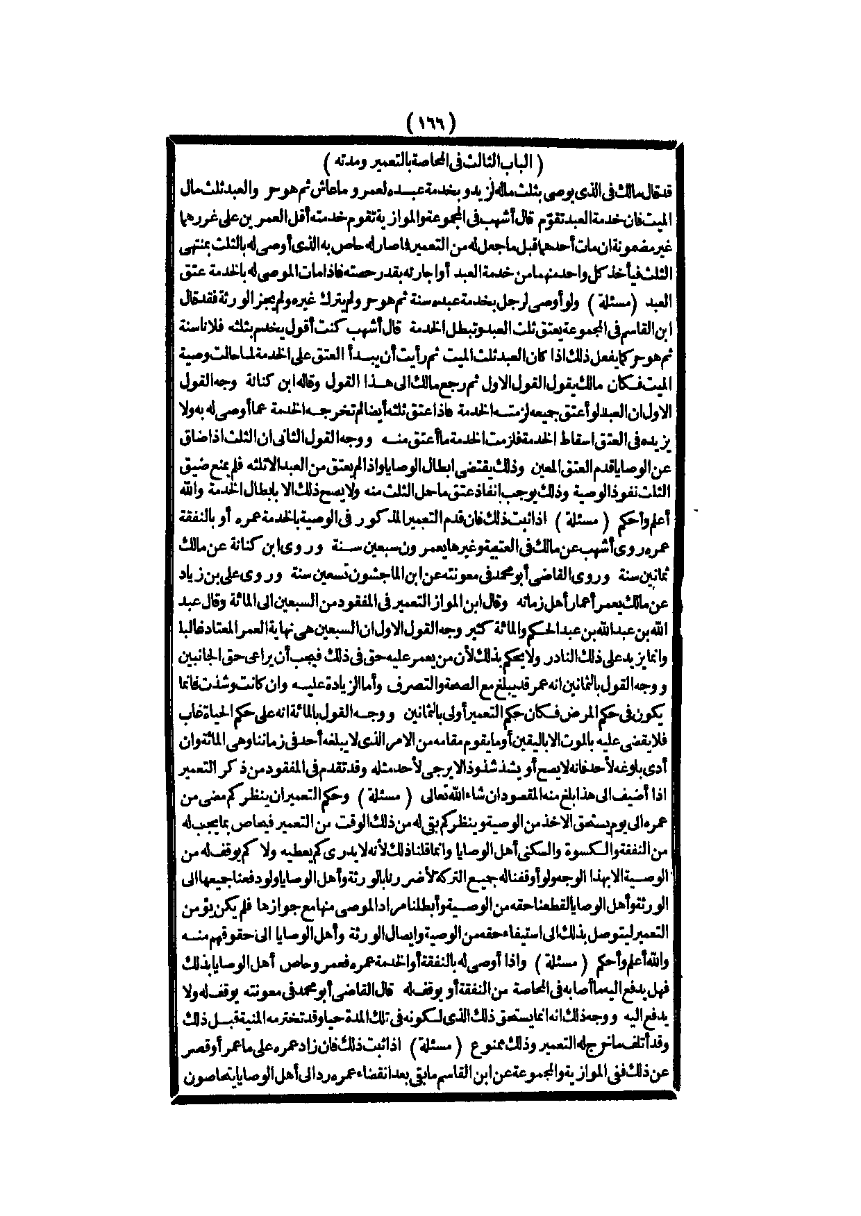 ـــــــــــــــــــــــــــــQ (الْبَابُ الثَّالِثُ فِي الْمُحَاصَّةِ بِالتَّعْمِيرِ وَمُدَّتِهِ) قَدْ قَالَ مَالِكٌ فِي الَّذِي يُوصِي بِثُلُثِ مَالِهِ لِزَيْدٍ وَبِخِدْمَةِ عَبْدِهِ لِعَمْرٍو مَا عَاشَ ثُمَّ هُوَ حُرٌّ وَالْعَبْدُ ثُلُثُ مَالِ الْمَيِّتِ فَإِنَّ خِدْمَةَ الْعَبْدِ تُقَوَّمُ قَالَ أَشْهَبُ فِي الْمَجْمُوعَةِ وَالْمَوَّازِيَّةِ تُقَوَّمُ خِدْمَتُهُ أَقَلَّ الْعُمْرَيْنِ عَلَى غَرَرِهِمَا غَيْرَ مَضْمُونَةٍ إنْ مَاتَ أَحَدُهُمَا قَبْلَ مَا جَعَلَ لَهُ مِنْ التَّعْمِيرِ فَمَا صَارَ لَهُ حَاصَّ بِهِ الَّذِي أُوصِيَ لَهُ بِالثُّلُثِ بِمُنْتَهَى الثُّلُثِ فَيَأْخُذُ كُلُّ وَاحِدٍ مِنْهُمَا مِنْ خِدْمَةِ الْعَبْدِ، أَوْ إجَارَتِهِ بِقَدْرِ حِصَّتِهِ فَإِذَا مَاتَ الْمُوصَى لَهُ بِالْخِدْمَةِ عَتَقَ الْعَبْدُ.