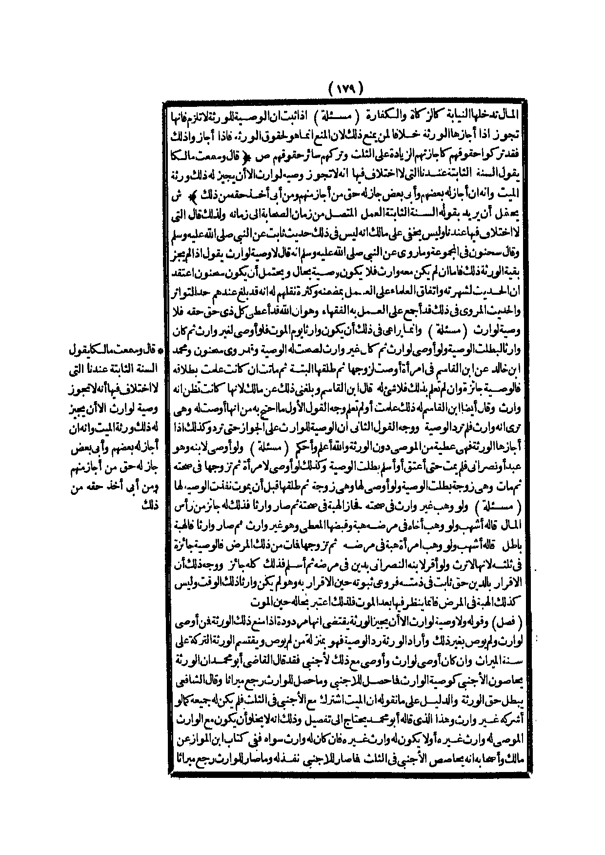 (ش) : يُحْتَمَلُ أَنْ يُرِيدَ بِقَوْلِهِ السَّنَةَ الثَّابِتَةَ الْعَمَلَ الْمُتَّصِلَ مِنْ زَمَانِ الصَّحَابَةِ إلَى زَمَانِهِ؛ وَلِذَلِكَ قَالَ الَّتِي لَا اخْتِلَافَ فِيهَا عِنْدَنَا، وَلَيْسَ يَخْفَى عَلَى مَالِكٍ أَنَّهُ لَيْسَ فِي ذَلِكَ حَدِيثٌ ثَابِتٌ عَنْ النَّبِيِّ - صَلَّى اللَّهُ عَلَيْهِ وَسَلَّمَ - وَقَالَ سَحْنُونٌ فِي الْمَجْمُوعَةِ وَمَا رُوِيَ عَنْ النَّبِيِّ - صَلَّى اللَّهُ عَلَيْهِ وَسَلَّمَ - أَنَّهُ قَالَ لَا وَصِيَّةَ لِوَارِثٍ يَقُولُ إذَا لَمْ يُجِزْ بَقِيَّةَ الْوَرَثَةِ ذَلِكَ فَأَمَّا إنْ لَمْ يَكُنْ مَعَهُ وَارِثٌ فَلَا يَكُونُ وَصِيَّةً بِحَالٍ وَيُحْتَمَلُ أَنْ يَكُونَ سَحْنُونٌ اعْتَقَدَ أَنَّ الْحَدِيثَ لِشُهْرَتِهِ وَاتِّفَاقِ الْعُلَمَاءِ عَلَى الْعَمَلِ بِمُضَمَّنِهِ وَكَثْرَةِ نَقْلِهِمْ لَهُ أَنَّهُ قَدْ بَلَغَ عِنْدَهُمْ حَدَّ التَّوَاتُرِ وَالْحَدِيثُ الْمَرْوِيُّ فِي ذَلِكَ قَدْ أَجْمَعَ عَلَى الْعَمَلِ بِهِ الْفُقَهَاءُ وَهُوَ «أَنَّ اللَّهَ قَدْ أَعْطَى كُلَّ ذِي حَقٍّ حَقَّهُ فَلَا وَصِيَّةَ لِوَارِثٍ» .