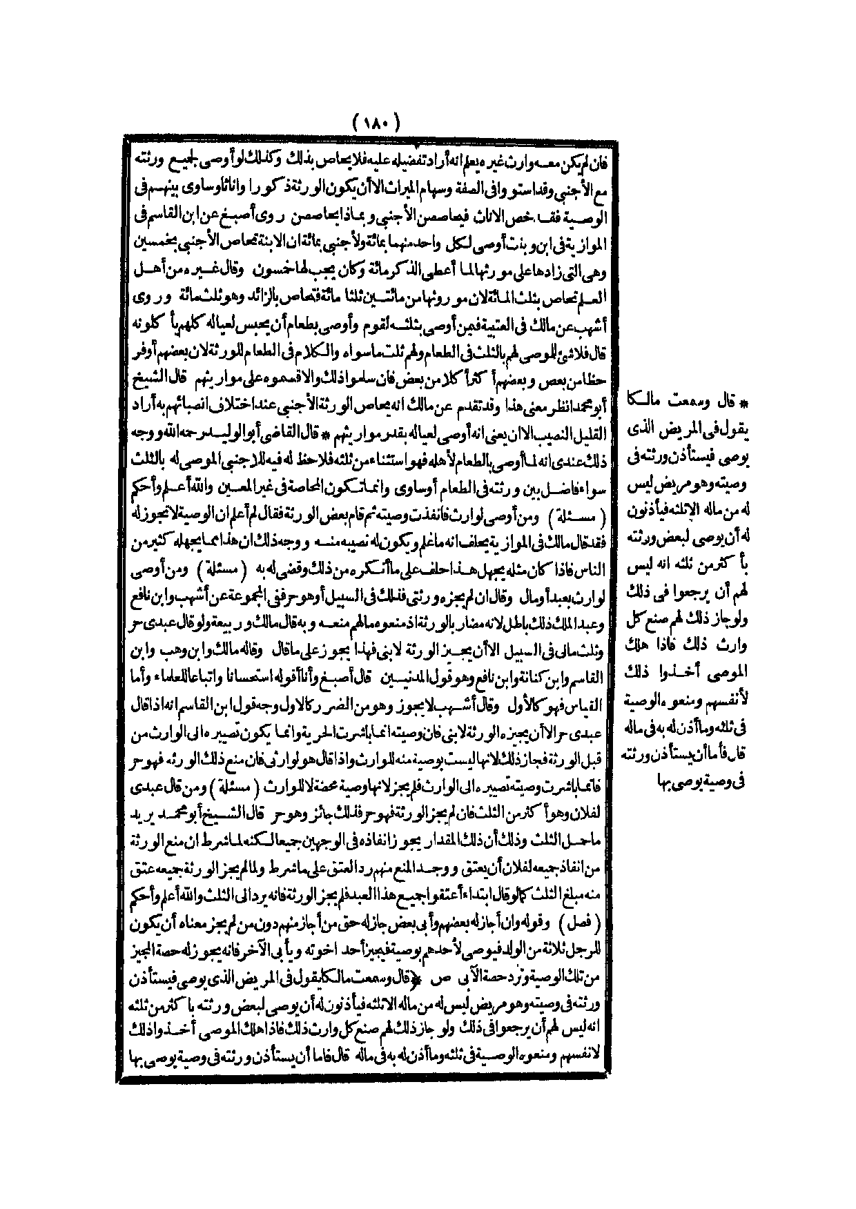 وَرَوَى أَشْهَبُ عَنْ مَالِكٍ فِي الْعُتْبِيَّةِ فِيمَنْ أَوْصَى بِثُلُثِهِ لِقَوْمٍ وَأَوْصَى بِطَعَامٍ أَنْ يَحْبِسَ لِعِيَالِهِ كُلَّهُمْ يَأْكُلُونَهُ قَالَ فَلَا شَيْءَ لِلْمُوصَى لَهُمْ بِالثُّلُثِ فِي الطَّعَامِ وَلَهُمْ ثُلُثُ مَا سِوَاهُ وَالْكَلَامُ فِي الطَّعَامِ لِلْوَرَثَةِ؛ لِأَنَّ بَعْضَهُمْ أَوْفَرُ حَظًّا مِنْ بَعْضٍ وَبَعْضُهُمْ أَكْثَرُ أَكْلًا مِنْ بَعْضٍ فَإِنْ سَلَّمُوا ذَلِكَ وَإِلَّا قَسَمُوهُ عَلَى مَوَارِيثِهِمْ قَالَ الشَّيْخُ أَبُو مُحَمَّدٍ اُنْظُرْ مَعْنَى هَذَا.