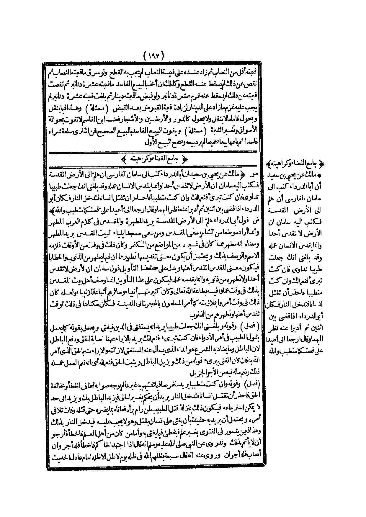 جَامِعُ الْقَضَاءِ وَكَرَاهِيَتِهِ (ص) : (مَالِكٌ عَنْ يَحْيَى بْنِ سَعِيدٍ أَنَّ أَبَا الدَّرْدَاءِ كَتَبَ إلَى سَلْمَانَ الْفَارِسِيِّ أَنْ هَلُمَّ إلَى الْأَرْضِ الْمُقَدَّسَةِ فَكَتَبَ إلَيْهِ سَلْمَانُ أَنَّ الْأَرْضَ لَا تُقَدِّسُ أَحَدًا وَإِنَّمَا يُقَدِّسُ الْإِنْسَانُ عَمَلَهُ وَقَدْ بَلَغَنِي أَنَّك جُعِلْت طَبِيبًا تُدَاوِي فَإِنْ كُنْت تُبْرِئُ فَنِعَمًا لَك، وَإِنْ كُنْت مُتَطَبِّبًا فَاحْذَرْ أَنْ تَقْتُلَ إنْسَانًا فَتَدْخُلَ النَّارَ فَكَانَ أَبُو الدَّرْدَاءِ إذَا قَضَى بَيْنَ اثْنَيْنِ، ثُمَّ أَدْبَرَا عَنْهُ نَظَرَ إلَيْهِمَا وَقَالَ ارْجِعَا إلَيَّ أَعِيدَا عَلِيَّ قِصَّتَكُمَا مُتَطَبِّبٌ وَاَللَّهِ) .
