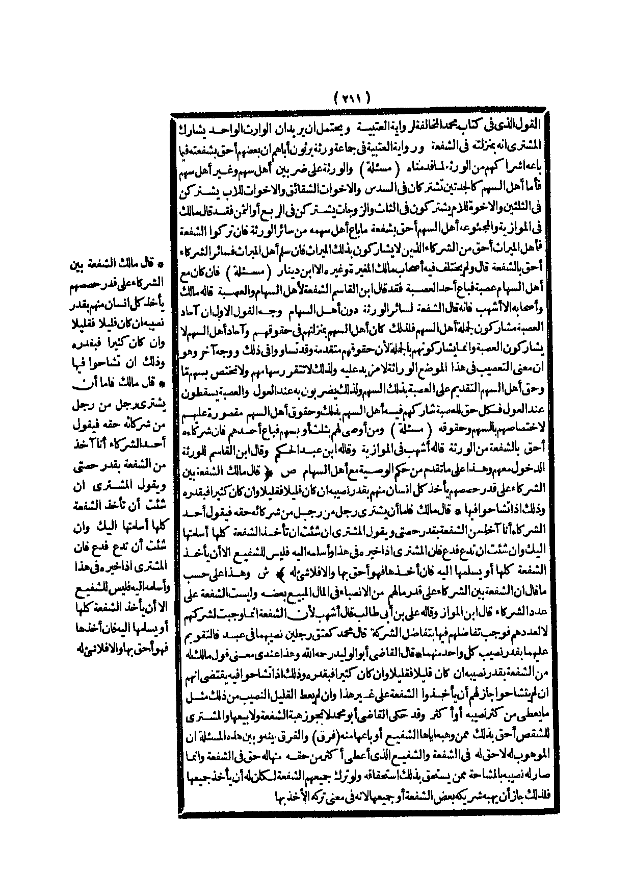 فَإِنْ كَانَ مَعَ أَهْلِ السِّهَامِ عَصَبَةٌ فَبَاعَ أَحَدُ الْعَصَبَةِ فَقَدْ قَالَ ابْنُ الْقَاسِمِ الشُّفْعَةُ لِأَهْلِ السِّهَامِ وَالْعَصَبَةِ قَالَهُ مَالِكٌ وَأَصْحَابُهُ إلَّا أَشْهَبَ فَإِنَّهُ قَالَ الشُّفْعَةُ لِسَائِرِ الْوَرَثَةِ دُونَ أَهْلِ السِّهَامِ وَجْهُ الْقَوْلِ الْأَوَّلِ أَنَّ آحَادَ الْعَصَبَةِ مُشَارِكُونَ لِجُمْلَةِ أَهْلِ السَّهْمِ فَلِذَلِكَ كَانَ أَهْلُ السَّهْمِ بِمَنْزِلَتِهِمْ فِي حُقُوقِهِمْ وَآحَادُ أَهْلِ السَّهْمِ لَا يُشَارِكُونَ الْعَصَبَةَ وَإِنَّمَا يُشَارِكُونَهُمْ بِالْجُمْلَةِ؛ لِأَنَّ حُقُوقَهُمْ مُتَقَدِّمَةٌ وَقَدْ تَسَاوَوْا فِي ذَلِكَ وَوَجْهٌ آخَرُ وَهُوَ أَنَّ مَعْنَى التَّعْصِيبِ فِي هَذَا الْمَوْضِعِ الْوِرَاثَةُ لَا مَزِيدَ عَلَيْهِ؛ وَلِذَلِكَ لَا تَتَقَرَّرُ سِهَامُهُمْ وَلَا تَخْتَصُّ بِسَهْمٍ مَا وَحَقُّ أَهْلِ السَّهْمِ التَّقْدِيمُ عَلَى الْعَصَبَةِ بِذَلِكَ السَّهْمِ؛ وَلِذَلِكَ يَضْرِبُونَ بِهِ عِنْدَ الْعَوْلِ وَالْعَصَبَةُ يَسْقُطُونَ عِنْدَ الْعَوْلِ فَكُلُّ حَقٍّ لِلْعَصَبَةِ شَارَكَهُمْ فِيهِ أَهْلُ السَّهْمِ بِذَلِكَ وَحُقُوقُ أَهْلِ السَّهْمِ مَقْصُورَةٌ عَلَيْهِمْ لِاخْتِصَاصِهِمْ بِالسَّهْمِ وَحُقُوقُهُ.