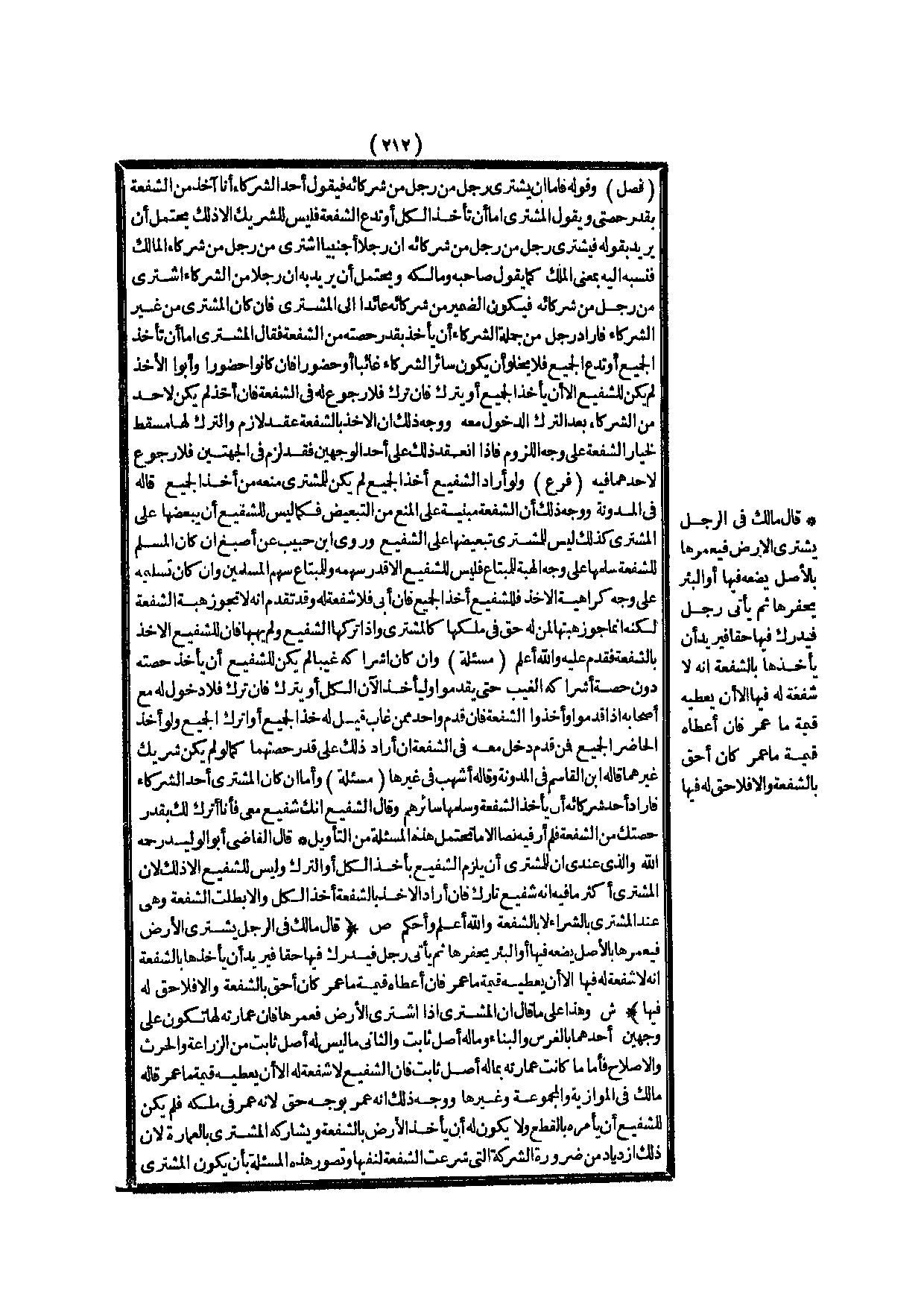 ـــــــــــــــــــــــــــــQ (فَصْلٌ) وَقَوْلُهُ فَإِمَّا أَنْ يَشْتَرِيَ رَجُلٌ مِنْ رَجُلٍ مِنْ شُرَكَائِهِ فَيَقُولُ أَحَدُ الشُّرَكَاءِ أَنَا آخُذُ مِنْ الشُّفْعَةِ بِقَدْرِ حِصَّتِي وَيَقُولُ الْمُشْتَرِي إمَّا أَنْ تَأْخُذَ الْكُلَّ، أَوْ تَدَعَ الشُّفْعَةَ فَلَيْسَ لِلشَّرِيكِ إلَّا ذَلِكَ يَحْتَمِلُ أَنْ يُرِيدَ بِقَوْلِهِ فَيَشْتَرِيَ رَجُلٌ مِنْ رَجُلٍ مِنْ شُرَكَائِهِ أَنَّ رَجُلًا أَجْنَبِيًّا اشْتَرَى مِنْ رَجُلٍ مِنْ شُرَكَاءِ الْمَالِكِ فَنَسَبَهُ إلَيْهِ بِمَعْنَى الْمِلْكِ كَمَا يَقُولُ صَاحِبُهُ وَمَالِكُهُ وَيَحْتَمِلُ أَنْ يُرِيدَ بِهِ أَنَّ رَجُلًا مِنْ الشُّرَكَاءِ اشْتَرَى مِنْ رَجُلٍ مِنْ شُرَكَائِهِ فَيَكُونُ الضَّمِيرُ مِنْ شُرَكَائِهِ عَائِدًا إلَى الْمُشْتَرِي فَإِنْ كَانَ الْمُشْتَرِي مِنْ غَيْرِ الشُّرَكَاءِ فَأَرَادَ رَجُلٌ مِنْ جُمْلَةِ الشُّرَكَاءِ أَنْ يَأْخُذَ بِقَدْرِ حِصَّتِهِ مِنْ الشُّفْعَةِ فَقَالَ الْمُشْتَرِي إمَّا أَنْ تَأْخُذَ الْجَمِيعَ، أَوْ تَدَعَ الْجَمِيعَ فَلَا يَخْلُو أَنْ يَكُونَ سَائِرُ الشُّرَكَاءِ غَائِبًا، أَوْ حُضُورًا فَإِنْ كَانُوا حُضُورًا وَأَبَوْا الْأَخْذَ لَمْ يَكُنْ لِلشَّفِيعِ إلَّا أَنْ يَأْخُذَ الْجَمِيعَ، أَوْ يَتْرُكَ فَإِنْ تَرَكَ فَلَا رُجُوعَ لَهُ فِي الشُّفْعَةِ فَإِنْ أَخَذَ لَمْ يَكُنْ لِأَحَدٍ مِنْ الشُّرَكَاءِ بَعْدَ التَّرْكِ الدُّخُولُ مَعَهُ، وَوَجْهُ ذَلِكَ أَنَّ الْأَخْذَ بِالشُّفْعَةِ عَقْدٌ لَازِمٌ وَالتَّرْكُ لَهَا مُسْقِطٌ لِخِيَارِ الشُّفْعَةِ عَلَى وَجْهِ اللُّزُومِ فَإِذَا انْعَقَدَ ذَلِكَ عَلَى أَحَدِ الْوَجْهَيْنِ فَقَدْ لَزِمَ فِي الْجِهَتَيْنِ فَلَا رُجُوعَ لِأَحَدِهِمَا فِيهِ.