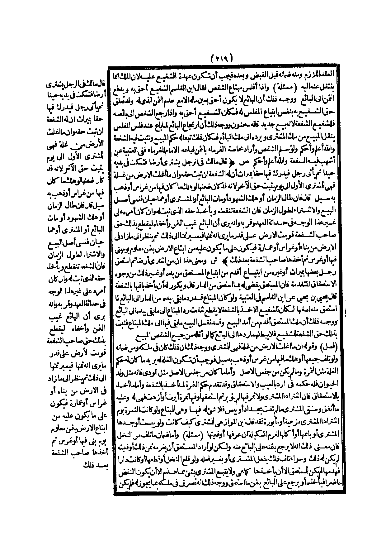 وَإِذَا أَفْلَسَ مُبْتَاعُ الشِّقْصِ فَقَالَ ابْنُ الْقَاسِمِ الشَّفِيعُ أَحَقُّ بِهِ وَيَدْفَعُ الثَّمَنَ إلَى الْبَائِعِ، وَوَجْهُ ذَلِكَ أَنَّ الْبَائِعَ لَا يَكُونُ أَحَقَّ بِعَيْنِ مَالِهِ إلَّا مَعَ عَدَمِ الثَّمَنِ الَّذِي لَهُ وَقَدْ تَعَلَّقَ حَقُّ الشَّفِيعِ بِهِ بِنَفْسِ ابْتِيَاعِ الْمُفْلِسِ لَهُ فَكَانَ الشَّفِيعُ أَحَقَّ بِهِ وَإِذَا رَجَعَ الشِّقْصُ إلَى بَائِعِهِ فَلِلشَّفِيعِ الشُّفْعَةُ؛ لِأَنَّهُ بَيْعٌ جَدِيدٌ قَالَهُ سَحْنُونٌ وَوَجْهُ ذَلِكَ أَنَّ ارْتِجَاعَ الْبَائِعِ لِمَا بَاعَ عِنْدَ فَلَسِ الْمُفْلِسِ يَنْقُلُ الْمَبِيعَ مِنْ مِلْكِ الْمُشْتَرِي وَيَرُدُّهُ إلَى مِلْكِ الْبَائِعِ فَكَانَ ذَلِكَ تَبَعًا لَهُ حُكْمُ الْمَبِيعِ وَتَثْبُتُ فِيهِ الشُّفْعَةُ وَاَللَّهُ أَعْلَمُ وَأَحْكَمُ وَلَوْ سَلَّمَ الشِّقْصَ وَأَرَادَ مُحَاصَّةَ الْغُرَمَاءِ بِالثَّمَنِ فَبَاعَهُ الْإِمَامُ لِلْغُرَمَاءِ فَفِي الْعُتْبِيَّةِ عَنْ أَشْهَبَ فِيهِ الشُّفْعَةُ وَاَللَّهُ أَعْلَمُ وَأَحْكَمُ.