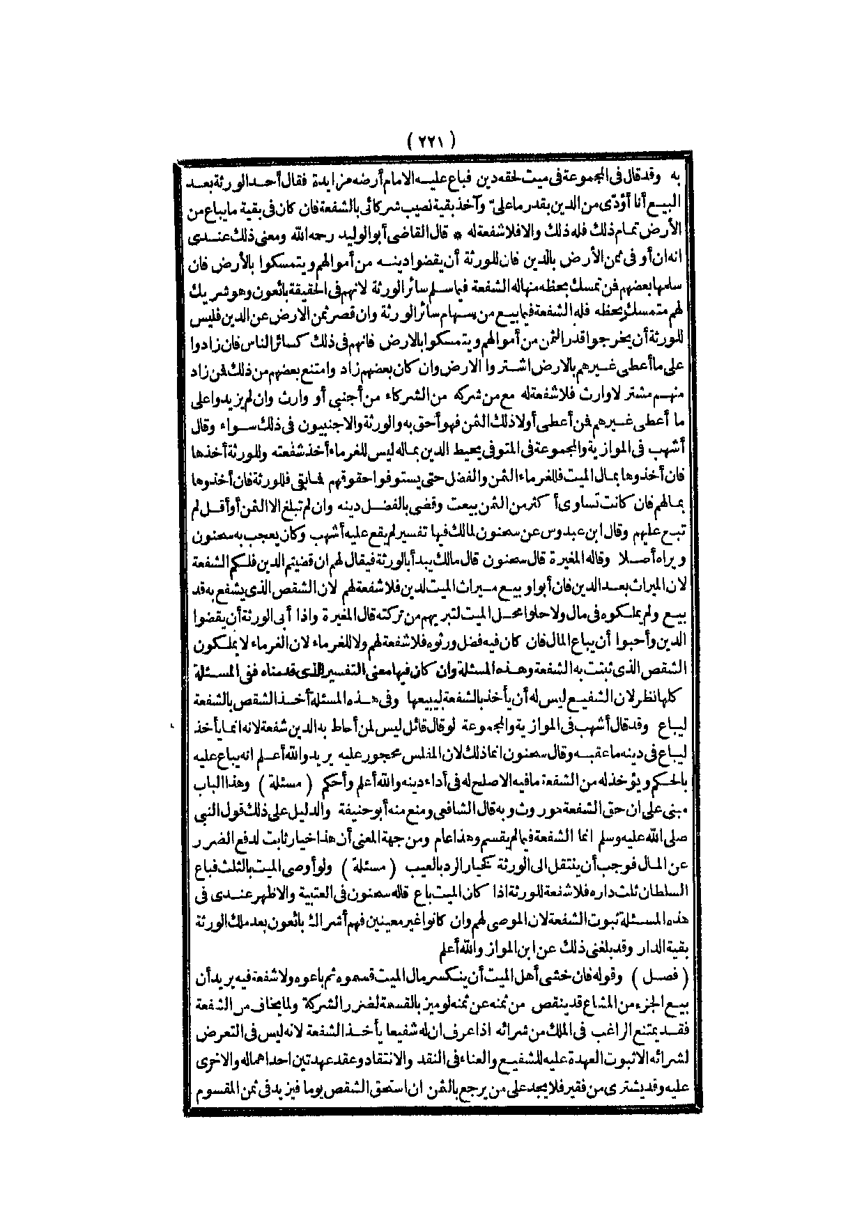 وَقَدْ قَالَ فِي الْمَجْمُوعَةِ فِي مَيِّتٍ لَحِقَهُ دَيْنٌ فَبَاعَ عَلَيْهِ الْإِمَامُ أَرْضَهُ مُزَايَدَةً فَقَالَ أَحَدُ الْوَرَثَةِ بَعْدَ الْبَيْعِ أَنَا أُؤَدِّي مِنْ الدَّيْنِ بِقَدْرِ مَا عَلَيَّ وَآخُذُ بَقِيَّةَ نَصِيبِ شُرَكَائِي بِالشُّفْعَةِ فَإِنْ كَانَ فِي بَقِيَّةِ مَا يُبَاعُ مِنْ الْأَرْضِ تَمَامُ ذَلِكَ فَلَهُ ذَلِكَ وَإِلَّا فَلَا شُفْعَةَ لَهُ قَالَ الْقَاضِي أَبُو الْوَلِيدِ - رَحِمَهُ اللَّهُ - وَمَعْنَى ذَلِكَ عِنْدِي أَنَّهُ إنْ أَوْفَى ثَمَنَ الْأَرْضِ بِالدَّيْنِ فَإِنَّ لِلْوَرَثَةِ أَنْ يَقْضُوا دَيْنَهُ مِنْ أَمْوَالِهِمْ وَيَتَمَسَّكُوا بِالْأَرْضِ فَإِنْ سَلَّمَهَا بَعْضُهُمْ فَمَنْ تَمَسَّكَ بِحَظِّهِ مِنْهَا لَهُ الشُّفْعَةُ فِيمَا سَلَّمَ سَائِرُ الْوَرَثَةِ؛ لِأَنَّهُمْ فِي الْحَقِيقَةِ بَائِعُونَ وَهُوَ شَرِيكٌ لَهُمْ مُتَمَسِّكٌ بِحَظِّهِ فَلَهُ الشُّفْعَةُ فِيمَا بِيعَ مِنْ سِهَامِ سَائِرِ الْوَرَثَةِ، وَإِنْ قَصُرَ ثَمَنُ الْأَرْضِ عَنْ الدَّيْنِ فَلَيْسَ لِلْوَرَثَةِ أَنْ يُخْرِجُوا قَدْرَ الثَّمَنِ مِنْ أَمْوَالِهِمْ وَيَتَمَسَّكُوا بِالْأَرْضِ فَإِنَّهُمْ فِي ذَلِكَ كَسَائِرِ النَّاسِ فَإِنْ زَادُوا عَلَى مَا أَعْطَى غَيْرُهُمْ بِالْأَرْضِ اشْتَرَوْا الْأَرْضَ، وَإِنْ كَانَ بَعْضُهُمْ زَادَ وَامْتَنَعَ بَعْضُهُمْ مِنْ ذَلِكَ فَمَنْ زَادَ مِنْهُمْ مُشْتَرٍ لَا وَارِثَ فَلَا شُفْعَةَ لَهُ مَعَ مَنْ شَرَكَهُ مِنْ الشُّرَكَاءِ مِنْ أَجْنَبِيٍّ، أَوْ وَارِثٍ وَإِنْ لَمْ يَزِيدُوا عَلَى مَا أَعْطَى غَيْرُهُمْ فَمَنْ أَعْطَى أَوَّلًا ذَلِكَ الثَّمَنَ فَهُوَ أَحَقُّ بِهِ وَالْوَرَثَةُ والأجنبيون فِي ذَلِكَ سَوَاءٌ.