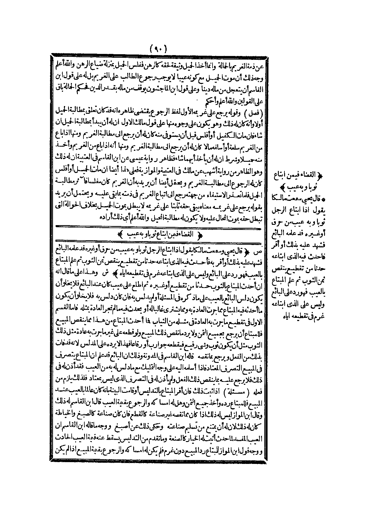 الْقَضَاءُ فِيمَنْ ابْتَاعَ ثَوْبًا وَبِهِ عَيْبٌ (ص) : (قَالَ يَحْيَى وَسَمِعْت مَالِكًا يَقُولُ: إذَا ابْتَاعَ الرَّجُلُ ثَوْبًا وَبِهِ عَيْبٌ مِنْ حَرْقٍ، أَوْ غَيْرِهِ قَدْ عَلِمَهُ الْبَائِعُ فَشَهِدَ عَلَيْهِ بِذَلِكَ، أَوْ أَقَرَّ بِهِ فَأَحْدَثَ فِيهِ الَّذِي ابْتَاعَهُ حَدَثًا مِنْ تَقْطِيعٍ يُنْقِصُ ثَمَنَ الثَّوْبِ ثُمَّ عَلِمَ الْمُبْتَاعُ بِالْعَيْبِ فَهُوَ رَدٌّ عَلَى الْبَائِعِ وَلَيْسَ عَلَى الَّذِي ابْتَاعَهُ غُرْمٌ فِي تَقْطِيعِهِ إيَّاهُ) .
