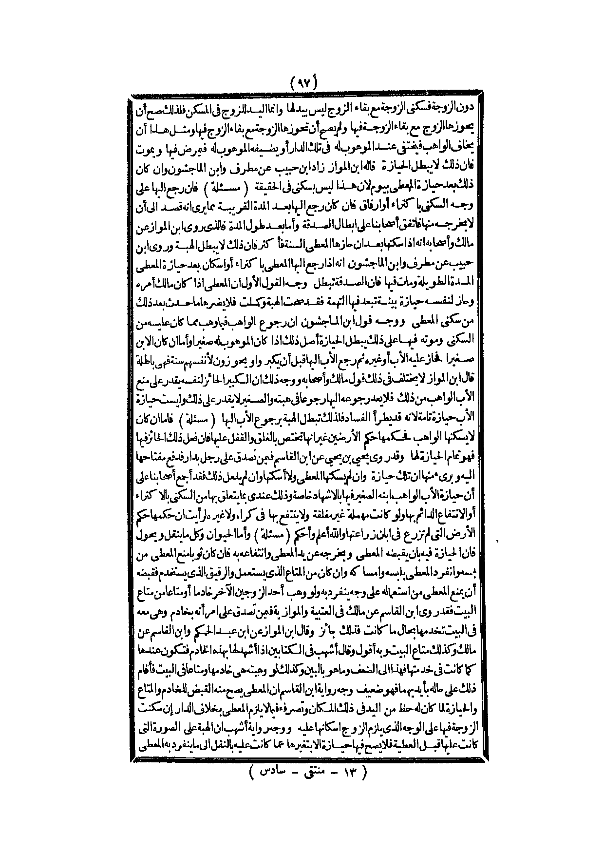 ـــــــــــــــــــــــــــــQدُونَ الزَّوْجَةِ فَسُكْنَى الزَّوْجَةِ مَعَ بَقَاءِ الزَّوْجِ لَيْسَ بِيَدٍ لَهَا، وَإِنَّمَا الْيَدُ لِلزَّوْجِ فِي الْمَسْكَنِ فَلِذَلِكَ صَحَّ أَنْ يَحُوزَهَا الزَّوْجُ مَعَ بَقَاءِ الزَّوْجَةِ فِيهَا وَلَمْ يَصِحَّ أَنْ تَحُوزَهَا الزَّوْجَةُ مَعَ بَقَاءِ الزَّوْجِ فِيهَا وَمِثْلُ هَذَا أَنْ يَخَافَ الْوَاهِبُ فَيَخْتَفِي عِنْدَ الْمَوْهُوبِ لَهُ فِي تِلْكَ الدَّارِ، أَوْ يُضَيِّفُهُ الْمَوْهُوبُ لَهُ فَيَمْرَضُ فِيهَا وَيَمُوتُ فَإِنَّ ذَلِكَ لَا يُبْطِلُ الْحِيَازَةَ قَالَهُ ابْنُ الْمَوَّازِ زَادَ ابْنُ حَبِيبٍ عَنْ مُطَرِّفٍ وَابْنِ الْمَاجِشُونِ، وَإِنْ كَانَ ذَلِكَ بَعْدَ حِيَازَةِ الْمُعْطَى بِيَوْمٍ؛ لِأَنَّ هَذَا لَيْسَ بِسُكْنَى فِي الْحَقِيقَةِ.