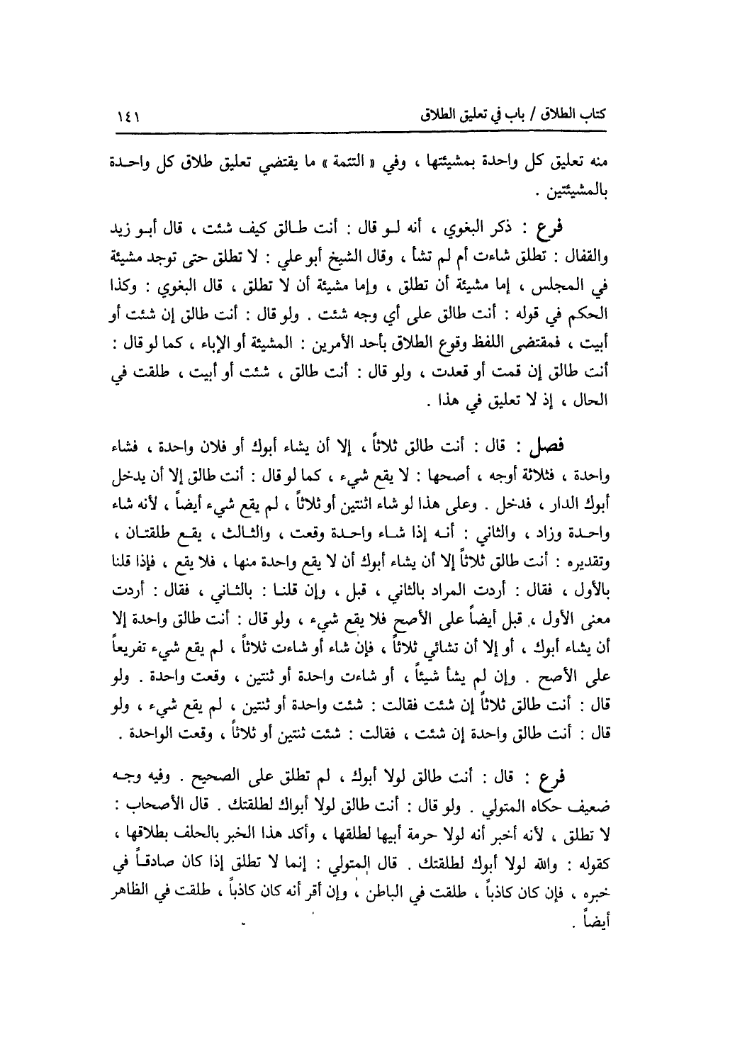 منه تعليق كل واحدة بمشيئتها، وفي التتمة ما يقتضي تعليق طلاق كل واحدة بالمشيئتين. فرع ذكر البغوي، أنه لو قال: أنت طالق كيف شئت، قال أبو زيد والقفال: تطلق شاءت أم لم تشأ، وقال الشيخ أبو علي: لا تطلق حتى توجد مشيئة في المجلس، إما مشيئة أن تطلق، وإما مشيئة أن لا تطلق، قال البغوي: وكذا الحكم في قوله: أنت طالق على أي وجه شئت. ولو قال: أنت طالق إن شئت أو أبيت، فمقتضى اللفظ وقوع الطلاق بأحد الامرين: المشيئة أو الاباء، كما لو قال: أنت طالق إن قمت أو قعدت، ولو قال: أنت طالق، شئت أو أبيت، طلقت في الحال، إذ لا تعليق في هذا. فصل قال: أنت طالق ثلاثا، إلا أن يشاء أبوك أو فلان واحدة، فشاء واحدة، فثلاثة أوجه، أصحها: لا يقع شئ، كما لو قال: أنت طالق إلا أن يدخل أبوك الدار، فدخل. وعلى هذا لو شاء اثنتين أو ثلاثا، لم يقع شئ أيضا، لانه شاء واحدة وزاد، والثاني: أنه إذا شاء واحدة وقعت، والثالث، يقع طلقتان، وتقديره: أنت طالق ثلاثا إلا أن يشاء أبوك أن لا يقع واحدة منها، فلا يقع، فإذا قلنا بالاول، فقال: أردت المراد بالثاني، قبل، وإن قلنا: بالثاني، فقال: أردت معنى الاول، قبل أيضا على الاصح فلا يقع شئ، ولو قال: أنت طالق واحدة إلا أن يشاء أبوك، أو إلا أن تشائي ثلاثا، فإن شاء أو شاءت ثلاثا، لم يقع شئ تفريعا على الاصح. وإن لم يشأ شيئا، أو شاءت واحدة أو ثنتين، وقعت واحدة. ولو قال: أنت طالق ثلاثا إن شئت فقالت: شئت واحدة أو ثنتين، لم يقع شئ، ولو قال: أنت طالق واحدة إن شئت، فقالت: شئت ثنتين أو ثلاثا، وقعت الواحدة. فرع قال: أنت طالق لولا أبوك، لم تطلق على الصحيح. وفيه وجه ضعيف حكاه المتولي. ولو قال: أنت طالق لولا أبواك لطلقتك. قال الاصحاب: لا تطلق، لانه أخبر أنه لولا حرمة أبيها لطلقها، وأكد هذا الخبر بالحلف بطلاقها، كقوله: والله لولا أبوك لطلقتك. قال المتولي: إنما لا تطلق إذا كان صادقا في خبره، فإن كان كاذبا، طلقت في الباطن، وإن أقر أنه كان كاذبا، طلقت في الظاهر أيضا.