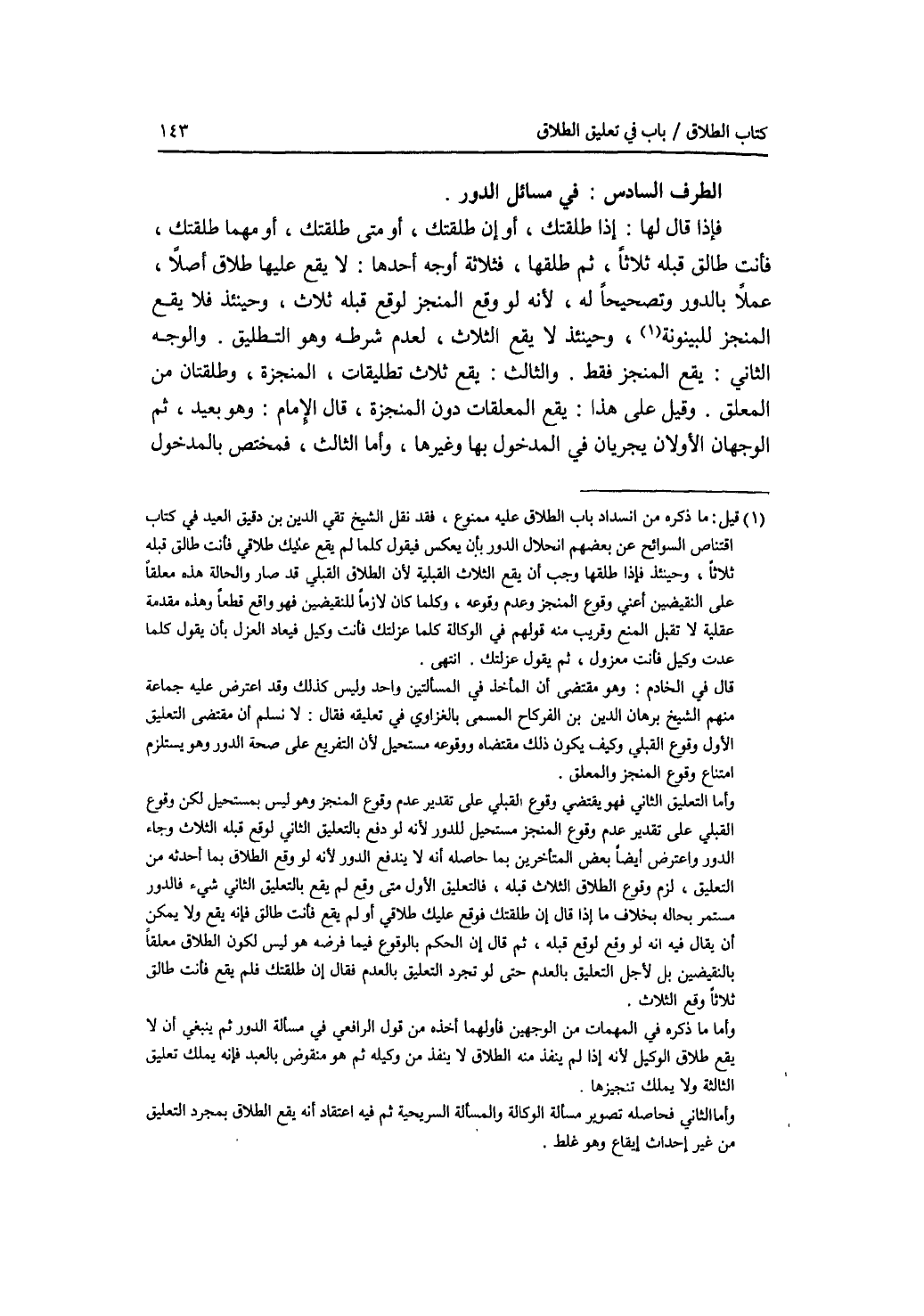الطرف السادس : في مسائل الدور فإذا قال لها: إذا طلقتك، أو إن طلقتك، أو متى طلقتك، أو مهما طلقتك، فأنت طالق قبله ثلاثا، ثم طلقها، فثلاثة أوجه أحدها: لا يقع عليها طلاق أصلا، عملا بالدور وتصحيحا له، لانه لو وقع المنجز لوقع قبله ثلاث، وحينئذ فلا يقع المنجز للبينونة، وحينئذ لا يقع الثلاث، لعدم شرطه وهو التطليق. والوجه الثاني: يقع المنجز فقط. والثالث: يقع ثلاث تطليقات، المنجزة، وطلقتان من المعلق. وقيل على هذا: يقع المعلقات دون المنجزة، قال الامام: وهو بعيد، ثم الوجهان الاولان يجريان في المدخول بها وغيرها، وأما الثالث، فمختص بالمدخول
