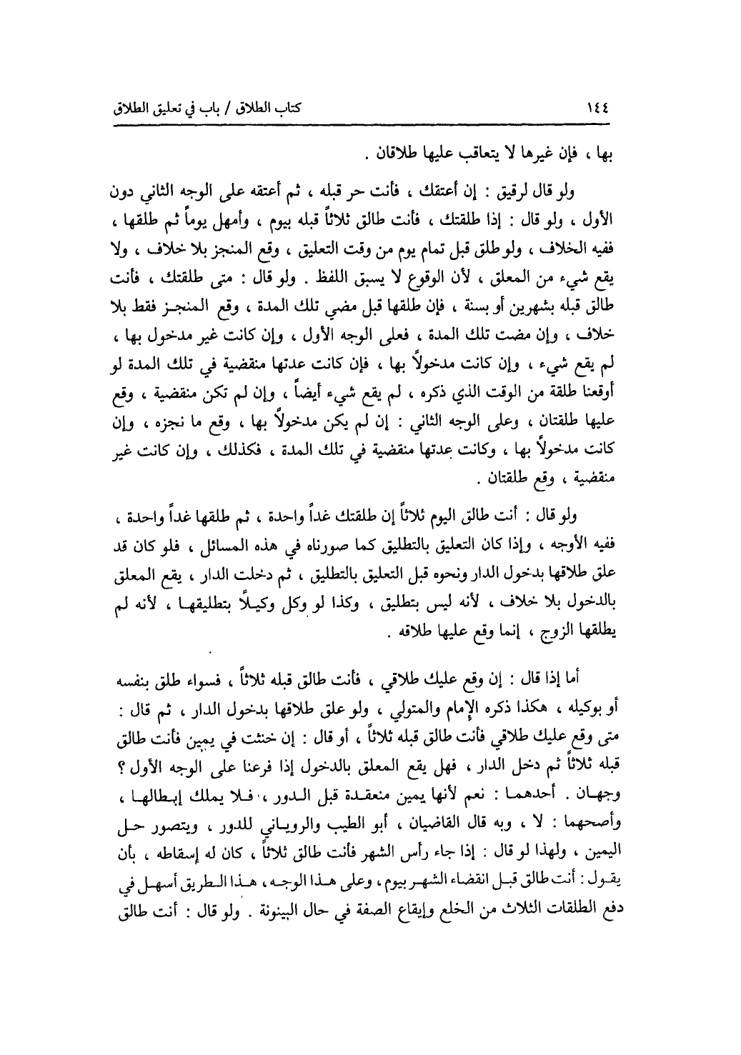 بها، فإن غيرها لا يتعاقب عليها طلاقان. ولو قال لرقيق: إن أعتقك، فأنت حر قبله، ثم أعتقه، عتق على الوجه الثاني دون الاول، ولو قال: إذا طلقتك، فأنت طالق ثلاثا قبله بيوم، وأمهل يوما ثم طلقها، ففيه الخلاف، ولو طلق قبل تمام يوم من وقت التعليق، وقع المنجز بلا خلاف، ولا يقع شئ من المعلق، لان الوقوع لا يسبق اللفظ. ولو قال: متى طلقتك، فأنت طالق قبله بشهرين أو بسنة، فإن طلقها قبل مضي تلك المدة، وقع المنجز فقط بلا خلاف، وإن مضت تلك المدة، فعلى الوجه الاول، وإن كانت غير مدخول بها، لم يقع شئ، وإن كانت مدخولا بها، فإن كانت عدتها منقضية في تلك المدة لو أوقعنا طلقة من الوقت الذي ذكره، لم يقع شئ أيضا، وإن لم تكن منقضية، وقع عليها طلقتان، وعلى الوجه الثاني: إن لم يكن مدخولا بها، وقع ما نجزه، وإن كانت مدخولا بها، وكانت عدتها منقضية في تلك المدة، فكذلك، وإن كانت غير منقضية، وقع طلقتان. ولو قال: أنت طالق اليوم ثلاثا إن طلقتك غدا واحدة، ثم طلقها غدا واحدة، ففيه الاوجه، وإذا كان التعليق بالتطليق كما صورناه في هذه المسائل، فلو كان قد علق طلاقها بدخول الدار ونحوه قبل التعليق بالتطليق، ثم دخلت الدار، يقع المعلق بالدخول بلا خلاف، لانه ليس بتطليق، وكذا لو وكل وكيلا بتطليقها، لانه لم يطلقها الزوج، إنما وقع عليها طلاقه. أما إذا قال: إن وقع عليك طلاقي، فأنت طالق قبله ثلاثا، فسواء طلق بنفسه أو بوكيله، هكذا ذكره الامام والمتولي، ولو علق طلاقها بدخول الدار، ثم قال: متى وقع عليك طلاقي فأنت طالق قبله ثلاثا، أو قال: إن حنثت في يميني فأنت طالق قبله ثلاثا ثم دخل الدار، فهل يقع المعلق بالدخول إذا فرعنا على الوجه الاول ؟ وجهان. أحدهما: نعم لانها يمين منعقدة قبل الدور، فلا يملك إبطالها، وأصحهما: لا، وبه قال القاضيان، أبو الطيب والروياني للدور، ويتصور حل اليمين، ولهذا لو قال: إذا جاء رأس الشهر فأنت طالق ثلاثا، كان له إسقاطه، بأن يقول: أنت طالق قبل انقضاء الشهر بيوم، وعلى هذا الوجه، هذا الطريق أسهل في دفع الطلقات الثلاث من الخلع وإيقاع الصفة في حال البينونة. ولو قال: أنت طالق