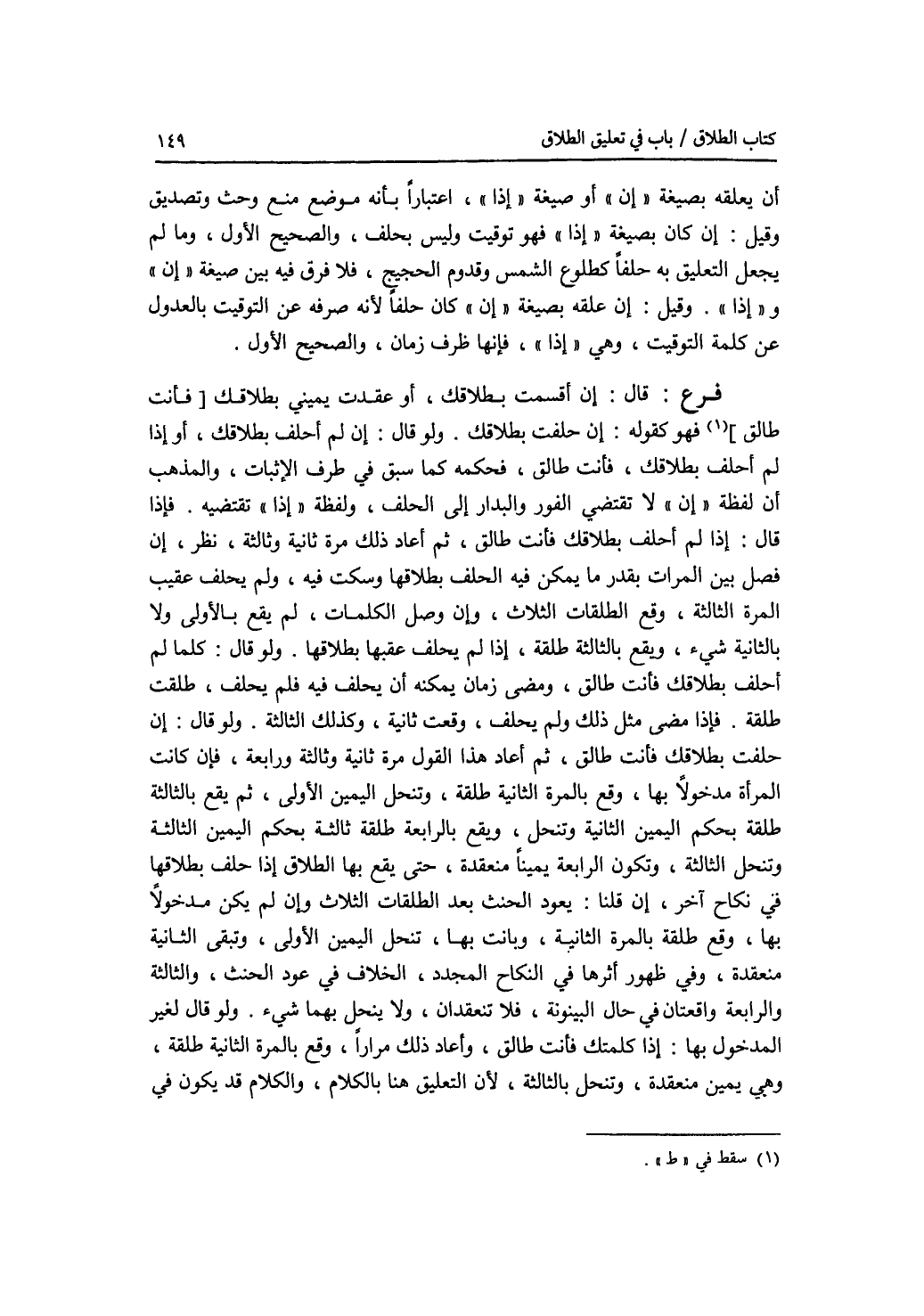 أن يعلقه بصيغة إن أو صيغة إذا، أعتبارا بأنه موضع منع وحث وتصديق وقيل: إن كان بصيغة إذا فهو توقيت وليس بحلف، والصحيح الاول، وما لم يجعل التعليق به حلفا كطلوع الشمس وقدوم الحجيج، فلا فرق فيه بين صيغة إن وإذا. وقيل: إن علقه بصيغة إن كان حلفا لانه صرفه عن التوقيت بالعدول عن كلمة التوقيت، وهي إذا، فإنها ظرف زمان، والصحيح الاول. فرع: قال: إن أقسمت بطلاقك، أو عقدت يميني بطلاقك، [ فأنت طالق ] فهو كقوله: إن حلفت بطلاقك. ولو قال: إن لم أحلف بطلاقك، أو إذا لم أحلف بطلاقك، فأنت طالق، فحكمه كما سبق في طرف الاثبات، والمذهب أن لفظة إن لا تقتضي الفور والبدار إلى الحلف، ولفظه إذا تقتضيه. فإذا قال: إذا لم أحلف بطلاقك فأنت طالق، ثم أعاد ذلك مرة ثانية وثالثة، نظر، إن فصل بين المرات بقدر ما يمكن فيه الحلف بطلاقها وسكت فيه، ولم يحلف عقيب المرة الثالثة، وقع الطلقات الثلاث، وإن وصل الكلمات، لم يقع بالاولى ولا بالثانية شئ، ويقع بالثالثة طلقة، إذا لم يحلف بطلاقها. ولو قال: كلما لم أحلف بطلاقك فأنت طالق، ومضى زمان يمكنه أن يحلف فيه فلم يحلف، طلقت طلقة،. فإذا مضى مثل ذلك ولم يحلف، وقعت ثانية، وكذلك الثالثة. ولو قال: إن حلفت بطلاقك فأنت طالق، ثم أعاد هذا القول مرة ثانية وثالثة ورابعة، فإن كانت المرأة مدخولا بها، وقع بالمرة الثانية طلقة، وتنحل اليمين الاولى، ثم يقع بالثالثة طلقة بحكم اليمين الثانية وتنحل، ويقع بالرابعة طلقة ثالثة بحكم اليمين الثالثة وتنحل الثالثة، وتكون الرابعة يمينا منعقدة، حتى يقع بها الطلاق إذا حلف بطلاقها في نكاح آخر، إن قلنا: يعود الحنث بعد الطلقات الثلاث وإن لم يكن مدخولا بها، وقع طلقة بالمرة الثانية، وبانت بها، تنحل اليمين الاولى، وتبقى الثانية منعقدة، وفي ظهور أثرها في النكاح المجدد، الخلاف في عود الحنث، والثالثة والرابعة واقعتان في حال البينونة، فلا تنعقدان، ولا ينحل بهما شئ. ولو قال لغير المدخول بها: إذا كلمتك فأنت طالق، وأعاد ذلك مرارا، وقع بالمرة الثانية طلقة، وهي يمين منعقدة، وتنحل بالثالثة، لان التعليق هنا بالكلام، والكلام قد يكون في