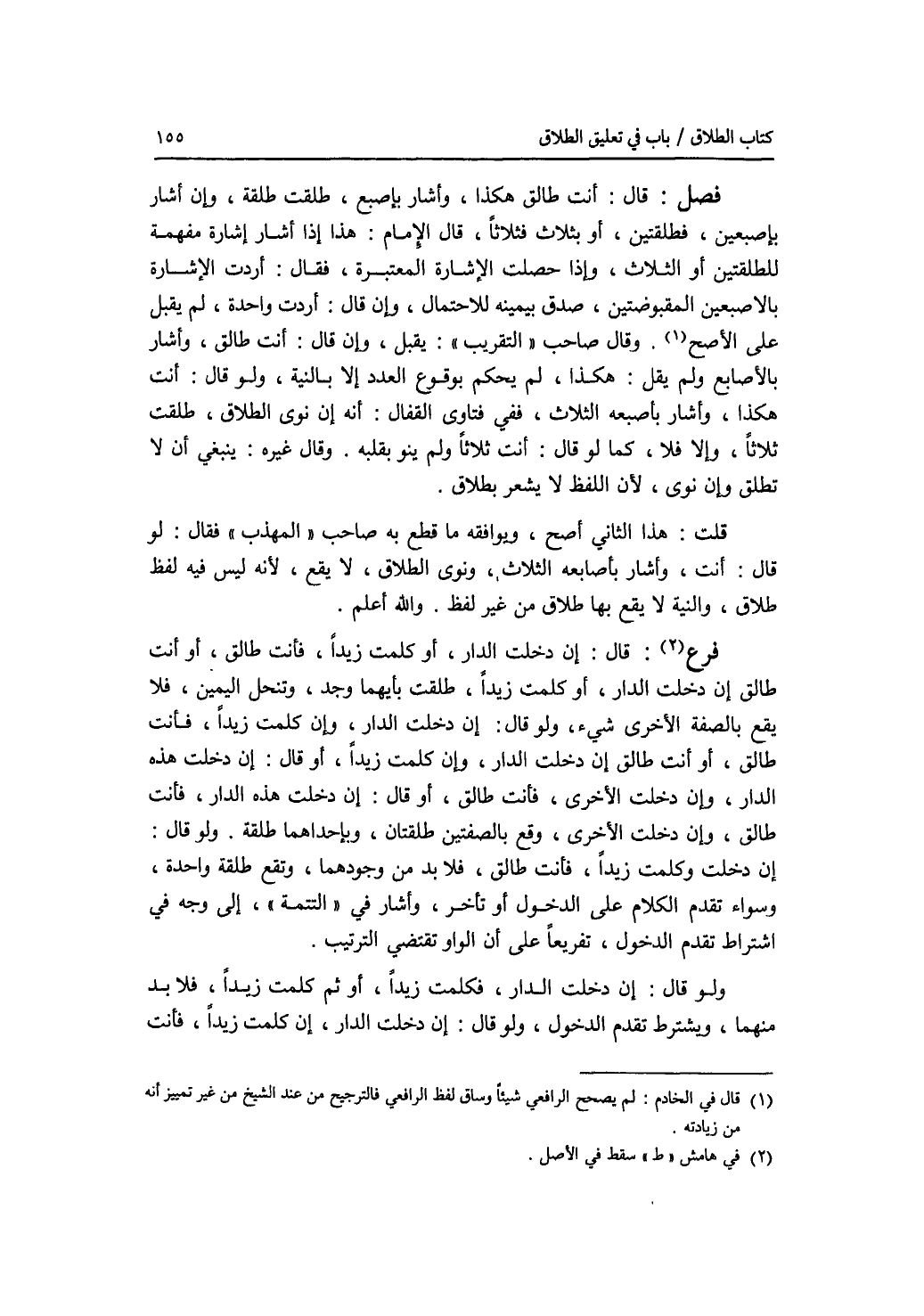 فصل قال: أنت طالق هكذا، وأشار بإصبع، طلقت طلقة، وإن أشار بإصبعين، فطلقتين، أو بثلاث فثلاثا، قال الامام: هذا إذا أشار إشارة مفهمة للطلقتين أو الثلاث، وإذا حصلت الاشارة المعتبرة، فقال: أردت الاشارة بالاصبعين المقبوضتين، صدق بيمينه للاحتمال، وإن قال: أردت واحدة، لم يقبل على الاصح. وقال صاحب التقريب: يقبل، وإن قال: أنت طالق، وأشار بالاصابع ولم يقل: هكذا، لم يحكم بوقوع العدد إلا بالنية، ولو قال: أنت هكذا، وأشار بأصبعه الثلاث، ففي فتاوى القفال: أنه إن نوى الطلاق، طلقت ثلاثا، وإلا فلا، كما لو قال: أنت ثلاثا ولم ينو بقلبه. وقال غيره: ينبغي أن لا تطلق وإن نوى، لان اللفظ لا يشعر بطلاق. قلت: هذا الثاني أصح، ويوافقه ما قطع به صاحب المهذب فقال: لو قال: أنت، وأشار بأصابعه الثلاث، ونوى الطلاق، لا يقع، لانه ليس فيه لفظ طلاق، والنية لا يقع بها طلاق من غير لفظ. والله أعلم. فرع قال: إن دخلت الدار، أو كلمت زيدا، فأنت طالق، أو أنت طالق إن دخلت الدار، أو كلمت زيدا، طلقت بأيهما وجد، وتنحل اليمين، فلا يقع بالصفة الاخرى شئ، ولو قال: إن دخلت الدار، وإن كلمت زيدا، فأنت طالق، أو أنت طالق إن دخلت الدار، وإن كلمت زيدا، أو قال: إن دخلت هذه الدار، وإن دخلت الاخرى، فأنت طالق، أو قال: إن دخلت هذه الدار، فأنت طالق، وإن دخلت الاخرى، وقع بالصفتين طلقتان، وبإحداهما طلقة. ولو قال: إن دخلت وكلمت زيدا، فأنت طالق، فلا بد من وجودهما، وتقع طلقة واحدة، وسواء تقدم الكلام على الدخول أو تأخر، وأشار في التتمة، إلى وجه في اشتراط تقدم الدخول، تفريعا على أن الواو تقتضي الترتيب. ولو قال: إن دخلت الدار، فكلمت زيدا، أو ثم كلمت زيدا، فلا بد منهما، ويشترط تقدم الدخول، ولو قال: إن دخلت الدار، إن كلمت زيدا، فأنت