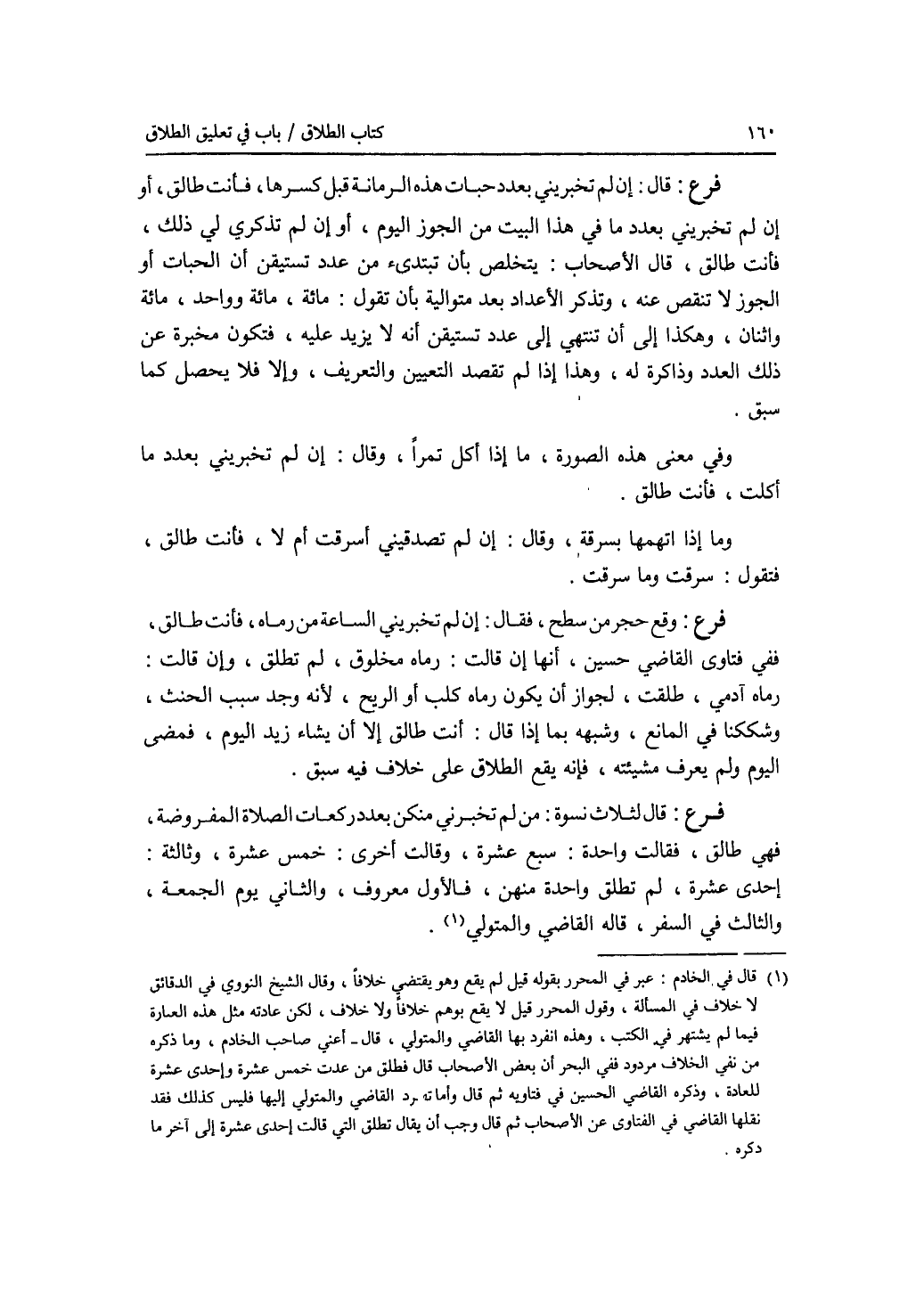 فرع قال: إن لم تخبريني بعدد حبات هذه الرمانة قبل كسرها، فأنت طالق، أو إن لم تخبريني بعدد ما في هذا البيت من الجوز اليوم، أو إن لم تذكري لي ذلك، فأنت طالق، قال الاصحاب: يتخلص بأن تبتدئ من عدد تستيقن أن الحبات أو الجوز لا تنقص عنه، وتذكر الاعداد بعد متوالية بأن تقول: مائة، مائة وواحد، مائة واثنان، وهكذا (إلى أن) تنتهي إلى عدد تستيقن أنه لا يزيد عليه، فتكون مخبرة عن ذلك العدد وذاكرة له، وهذا إذا لم تقصد التعيين والتعريف، وإلا فلا يحصل كما سبق. وفي معنى هذه الصورة، ما إذا أكل تمرا، وقال: إن لم تخبريني بعدد ما أكلت، فأنت طالق. وما إذا اتهمها بسرقة، وقال: إن لم تصدقيني أسرقت أم لا، فأنت طالق، فتقول: سرقت وما سرقت. فرع وقع حجر من سطح، فقال: إن لم تخبريني الساعة من رماه، فأنت طالق، ففي فتاوى القاضي حسين: أنها إن قالت: رماه مخلوق، لم تطلق، وإن قالت: رماه آدمي، طلقت الجواز أن يكون رماه كلب أو الريح، لانه وجد سبب الحنث، وشككنا في المانع، وشبهه بما إذا قال: أنت طالق إلا أن يشاء زيد اليوم، فمضى اليوم ولم يعرف مشيئته، فإنه يقع الطلاق على خلاف فيه سبق. فرع قال لثلاث نسوة: من لم تخبرني منكن بعدد ركعات الصلاة المفروضة، فهي طالق، فقالت واحدة: سبع عشرة، وقالت أخرى: خمس عشرة، وثالثة: إحدى عشرة، لم تطلق واحدة منهن، فالاول معروف، والثاني يوم الجمعة، والثالث في السفر، قاله القاضي والمتولي.