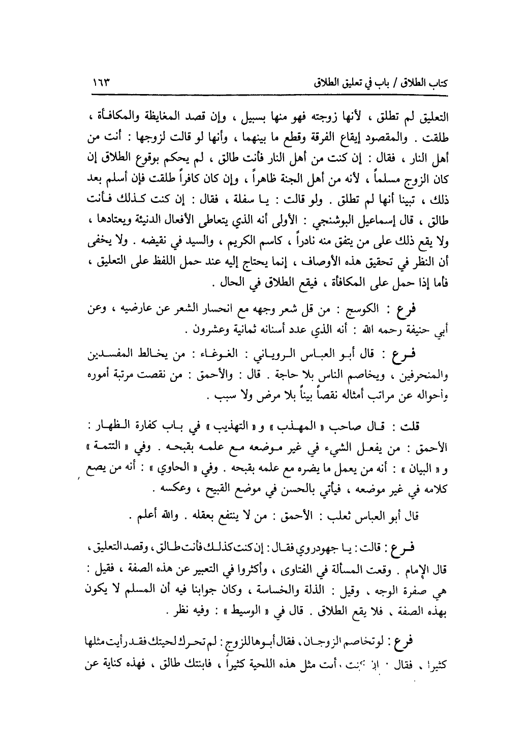 التعليق لم تطلق، لانها زوجته فهو منها بسبيل، وإن قصد المغايظة والمكافأة، طلقت. والمقصود إيقاع الفرقة وقطع ما بينهما، وأنها لو قالت لزوجها: أنت من أهل النار، فقال: إن كنت من أهل النار فأنت طالق، لم يحكم بوقوع الطلاق إن كان الزوج مسلما، لانه من أهل الجنة ظاهرا، وإن كان كافرا طلقت فإن أسلم بعد ذلك، تبينا أنها لم تطلق. ولو قالت: يا سفلة، فقال: إن كنت كذلك فأنت طالق، قال اسماعيل البوشنجي: الاولى أنه الذي يتعاطى الافعال الدنيئة ويعتادها، ولا يقع ذلك على من يتفق منه نادرا، كاسم الكريم، والسيد في نقيضه. ولا يخفى أن النظر في تحقيق هذه الاوصاف، إنما يحتاج إليه عند حمل اللفظ على التعليق، فأما إذا حمل على المكافأة، فيقع الطلاق في الحال. فرع الكوسج: من قل شعر وجهه مع انحسار الشعر عن عارضيه، وعن أبي حنيفة رحمه الله: أنه الذي عدد أسنانه ثمانية وعشرون. فرع قال أبو العباس الروياني: الغوغاء: من يخالط المفسدين والمنحرفين، ويخاصم الناس بلا حاجة. قال: والاحمق: من نقصت مرتبة أموره وأحواله عن مراتب أمثاله نقصا بينا بلا مرض ولا سبب. قلت: قال صاحب المهذب والتهذيب في باب كفارة الظهار: الاحمق: من يفعل الشئ في غير موضعه مع علمه بقبحه. وفي التتمة والبيان أنه من يعمل ما يضره مع علمه بقبحه. وفي الحاوي: أنه من يضع كلامه في غير موضعه، فيأتي بالحسن في موضع القبيح، وعكسه. قال أبو العباس ثعلب: الاحمق: من لا ينتفع بعقله. والله أعلم. فرع قالت: يا جهودروي فقال: إن كنت كذلك فأنت طالق، وقصد التعليق، قال الامام: وقعت المسألة في الفتاوى، وأكثروا في التعبير عن هذه الصفة، فقيل: هي صفرة الوجه، وقيل: الذلة والخساسة، وكان جوابنا فيه أن المسلم لا يكون بهذه الصفة، فلا يقع الطلاق. قال في الوسيط: وفيه نظر. فرع لو تخاصم الزوجان، فقال أبوها للزوج: لم تحرك لحيتك فقد رأيت مثلها كثيرا، فقال: إن كنت رأيت مثل هذه اللحية كثيرا، فابنتك طالق، فهذه كناية عن