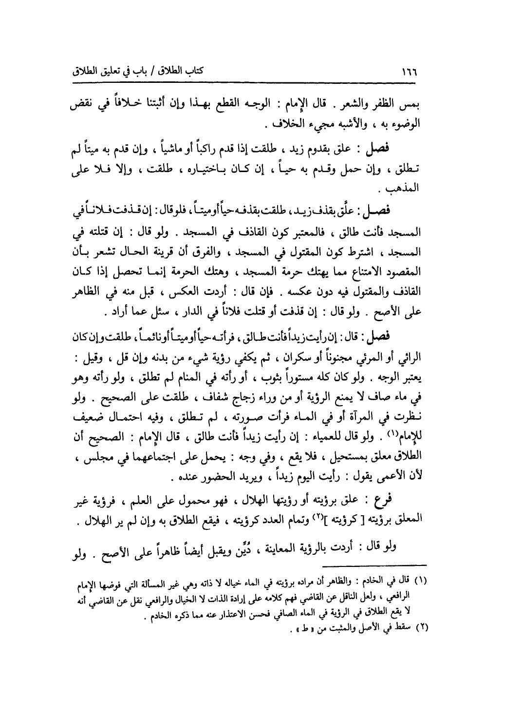 بمس الظفر والشعر. قال الامام: الوجه القطع بهذا وإن أثبتنا خلافا في نقض الوضوء به، والاشبه مجئ الخلاف. فصل علق بقدوم زيد، طلقت إذا قدم راكبا أو ماشيا، وإن قدم به ميتا لم تطلق، وإن حمل وقدم به حيا، إن كان باختياره، طلقت، وإلا فلا على المذهب. فصل علق بقذف زيد، طلقت بقذفه حيا أو ميتا، فلو قال: إن قذفت فلانا في المسجد فأنت طالق، فالمعتبر كون القاذف في المسجد. ولو قال: إن قتلته في المسجد، اشترط كون المقتول في المسجد، والفرق أن قرينة الحال تشعر بأن المقصود الامتناع مما يهتك (حرمة) المسجد، وهتك الحرمة إنما تحصل إذا كان القاذف والمقتول فيه دون عكسه، فإن قال: أردت العكس، قبل منه في الظاهر على الاصح. ولو قال: إن قذفت أو قتلت فلانا في الدار، سئل عما أراد. فصل قال: إن رأيت زيدا فأنت طالق، فرأته حيا أو ميتا أو نائما، طلقت وإن كان الرائي أو المرئي مجنونا أو سكران، ثم يكفي رؤية شئ من بدنه وإن قل، وقيل: يعتبر الوجه. ولو كان كله مستورا بثوب، أو رأته في المنام لم تطلق، ولو رأته وهو في ماء صاف لا يمنع الرؤية أو من وراء زجاج شفاف، طلقت على الصحيح. ولو نظرت في المرآة أو في الماء فرأت صورته، لم تطلق، وفيه احتمال ضعيف للامام. ولو قال للعمياء: إن رأيت زيدا فأنت طالق، قال الامام: الصحيح أن الطلاق معلق بمستحيل، فلا يقع، وفي وجه: يحمل على اجتماعهما في مجلس، لان الاعمى يقول: رأيت اليوم زيدا، ويريد الحضور عنده. فرع علق برؤيته أو رؤيتها الهلال، فهو محمول على العلم، فرؤية غير المعلق برؤيته (كرؤيته) وتمام العدد كرؤيته، فيقع الطلاق به وإن لم ير الهلال. ولو قال: أردت بالرؤية المعاينة، دين ويقبل أيضا ظاهرا على الاصح. ولو