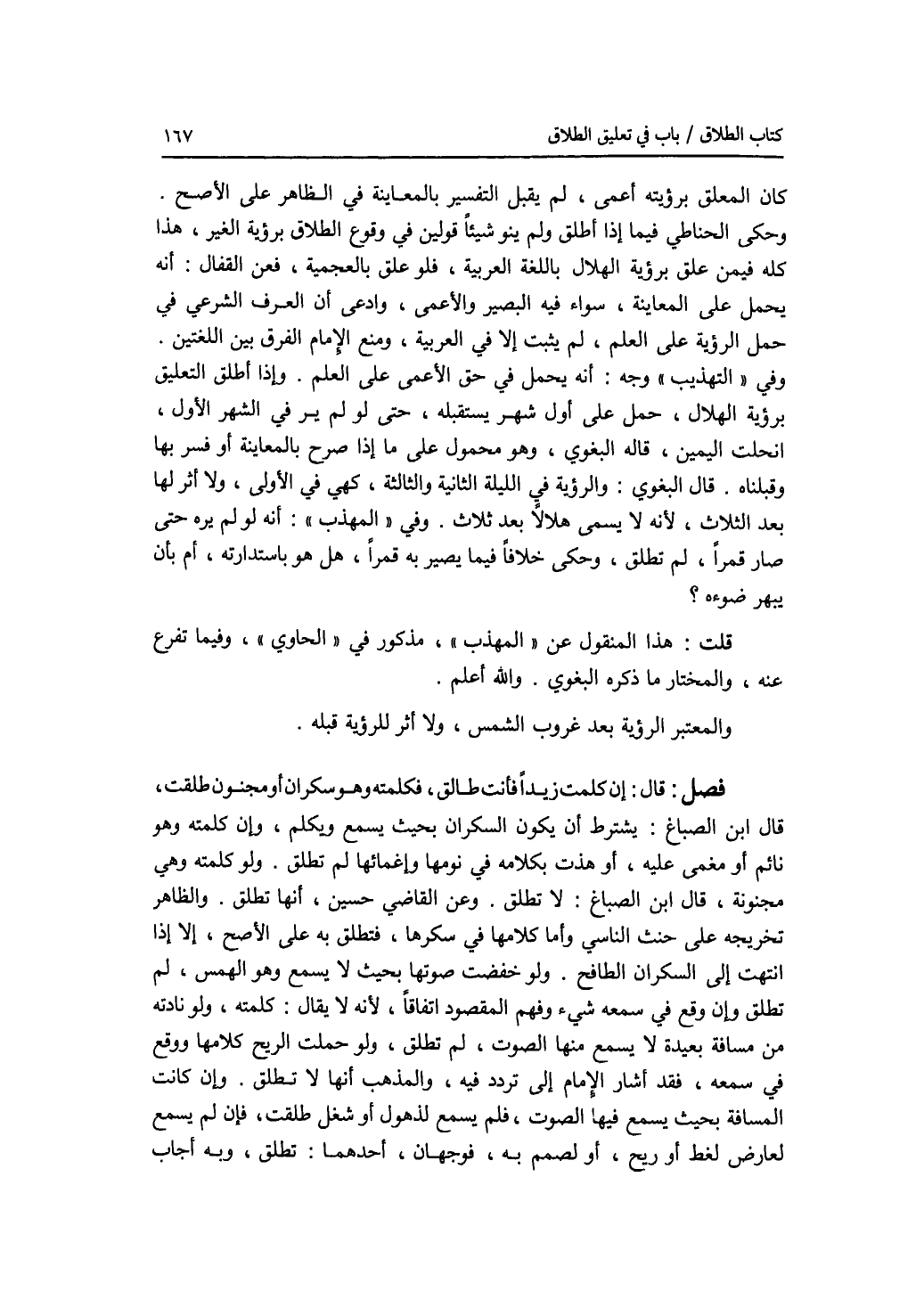 كان المعلق برؤيته أعمى، لم يقبل التفسير بالمعاينة في الظاهر على الاصح. وحكى الحناطي فيما إذا أطلق ولم ينو شيئا قولين في وقوع الطلاق برؤية الغير، هذا كله فيمن علق برؤية الهلال باللغة العربية، فلو علق بالعجمية، فعن القفال: أنه يحمل على المعاينة، سواء فيه البصير والاعمى، وادعى أن العرف الشرعي في حمل الرؤية على العلم، لم يثبت إلا في العربية، ومنع الامام الفرق بين اللغتين. وفي التهذيب وجه: أنه يحمل في حق الاعمى على العلم. وإذا أطلق التعليق برؤية الهلال، حمل على أول شهر يستقبله، حتى لو لم ير في الشهر الاول، انحلت اليمين، قاله البغوي، وهو محمول على ما إذا صرح بالمعاينة أو فسر بها وقبلناه. قال البغوي: والرؤية في الليلة الثانية والثالثة، كهي في الاولى، ولا أثر لها بعد الثلاث، لانه لا يسمى هلالا بعد ثلاث. وفي المهذب: أنه لو لم يره حتى صار قمرا، لم تطلق، وحكى خلافا فيما يصير به قمرا، هل هو باستدارته، أم بأن يبهر ضوؤه ؟ قلت: هذا المنقول عن المهذب، مذكور في الحاوي، وفيما تفرع عنه، والمختار ما ذكره البغوي. والله أعلم. والمعتبر الرؤية بعد غروب الشمس، ولا أثر للرؤية قبله. فصل قال: إن كلمت زيدا فأنت طالق، فكلمته وهو سكران أو مجنون طلقت، قال ابن الصباغ: يشترط أن يكون السكران بحيث يسمع ويكلم، وإن كلمته وهو نائم أو مغمى عليه، أو هذت بكلامه في نومها وإغمائها لم تطلق. ولو كلمته وهي مجنونة، قال ابن الصباغ: لا تطلق. وعن القاضي حسين، أنها تطلق. والظاهر تخريجه على حنث الناسي وأما كلامها في سكرها، فتطلق به على الاصح، إلا إذا انتهت إلى السكران الطافح. ولو خفضت صوتها بحيث لا يسمع وهو الهمس، لم تطلق وإن وقع في سمعه شئ وفهم المقصود اتفاقا، لانه لا يقال: كلمته، ولو نادته من مسافة بعيدة لا يسمع منها الصوت، لم تطلق، ولو حملت الريح كلامها ووقع في سمعه، فقد أشار الامام إلى تردد فيه، والمذهب أنها لا تطلق. وإن كانت المسافة بحيث يسمع فيها الصوت، فلم يسمع لذهول أو شغل طلقت، فإن لم يسمع لعارض لغط أو ريح، أو لصمم به، فوجهان، أحدهما: تطلق، وبه أجاب