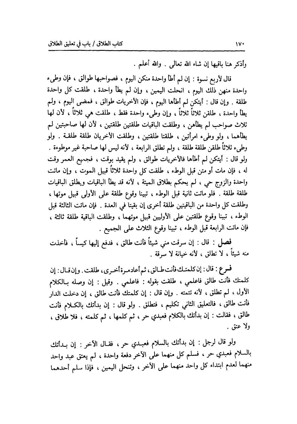 وأذكر هنا باقيها إن شاء الله تعالى. والله أعلم. قال لاربع نسوة: إن لم أطأ واحدة منكن اليوم، فصواحبها طوالق، فإن وطئ واحدة منهن ذلك اليوم، انحلت اليمين، وإن لم يطأ واحدة، طلقت كل واحدة طلقة. وإن قال: أيتكن لم أطأها اليوم، فإن الاخريات طوالق، فمضى اليوم، ولم يطأ واحدة، طلقن ثلاثا ثلاثا، وإن وطئ واحدة فقط، طلقت هي ثلاثا، لان لها ثلاث صواحب لم يطأهن، وطلقت الباقيات طلقتين طلقتين، لان لها صاحبتين لم يطأهما، ولو وطئ امرأتين، طلقتا طلقتين، وطلقت الاخريان طلقة طلقة. ولو وطئ ثلاثا طلقن طلقة طلقة، ولم تطلق الرابعة، لانه ليس لها صاحبة غير موطوءة. ولو قال: أيتكن لم أطأها فالاخريات طوالق، ولم يقيد بوقت، فجميع العمر وقت له، فإن مات أو متن قبل الوطئ، طلقت كل واحدة ثلاثا قبيل الموت، وإن ماتت واحدة والزوج حي، لم يحكم بطلاق الميتة، لانه قد يطأ الباقيات ويطلق الباقيات طلقة طلقة. فلو ماتت ثانية قبل الوطئ، تبينا وقوع طلقة على الاولى قبيل موتها، وطلقت كل واحدة من الباقيتين طلقة أخرى إن بقيتا في العدة. فإن ماتت الثالثة قبل الوطئ، تبينا وقوع طلقتين على الاوليين قبيل موتهما، وطلقت الباقية طلقة ثالثة، فإن ماتت الرابعة قبل الوطئ، تبينا وقوع الثلاث على الجميع. فصل قال: إن سرقت مني شيئا فأنت طالق، فدفع إليها كيسا، فأخذت منه شيئا، لا تطلق، لنه خيانة لا سرقة. فرع قال: إن كلمتك فأنت طالق، ثم أعاد مرة أخرى، طلقت. وإن قال: إن كلمتك فأنت طالق فاعلمي، طلقت بقوله: فاعلمي وقيل: إن وصله بالكلام الاول، لم تطلق، لانه تتمته. وإن قال: إن كلمتك فانت طالق، إن دخل الدار فأنت طالق، فالتعليق الثاني تكليم، فتطلق. ولو قال: إن بدأتك بالكلام فأنت طالق، فقالت: إن بدأتك بالكلام فعبدي حر، ثم كلمها، ثم كلمته، فلا طلاق، ولا عتق. ولو قال لرجل: إن بدأتك بالسلام فعبدي حر، فقال الآخر: إن بدأتك بالسلام فعبدي حر، فسلم كل منهما على الآخر دفعة واحدة، لم يعتق عبد واحد منهما لعدم ابتداء كل واحدة منهما على الآخر، وتنحل اليمين، فإذا سلم أحدهما
