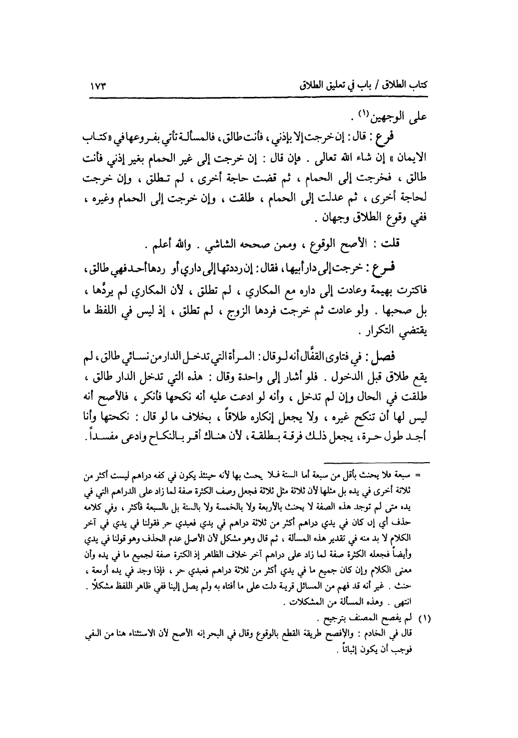 على الوجهين. فرع قال: إن خرجت إلا باذني، فأنت طالق، فالمسألة تأتي بفروعها في كتاب الايمان إن شاء الله تعالى. فإن قال: إن خرجت إلى غير الحمام بغير إذني فأنت طالق، فخرجت إلى الحمام، ثم قضت حاجة أخرى، لم تطلق، وإن خرجت لحاجة أخرى، ثم عدلت إلى الحمام، طلقت، وإن خرجت إلى الحمام وغيره، ففي وقوع الطلاق وجهان. قلت: الاصح الوقوع، وممن صححه الشاشي. والله أعلم. فرع خرجت إلى دار أبيها، فقال: إن رددتها إلى داري أو ردها أحد فهي طالق، فاكترت بهيمة وعادت إلى داره مع المكاري، لم تطلق، لان المكاري لم يردها، بل صحبها. ولو عادت ثم خرجت فردها الزوج، لم تطلق، إذ ليس في اللفظ ما يقتضي التكرار. فصل في فتاوى القفال أنه لو قال: المرأة التي تدخل الدار من نسائي طالق، لم يقع طلاق قبل الدخول. فلو أشار إلى واحدة وقال: هذه التي تدخل الدار طالق، طلقت في الحال وإن لم تدخل، وأنه لو ادعت عليه أنه نكحها فأنكر، فالاصح أنه ليس لها أن تنكح غيره، ولا يجعل إنكاره طلاقا، بخلاف ما لو قال: نكحتها وأنا أجد طول حرة، يجعل ذلك فرقة بطلقة، لان هناك أقر بالنكاح وادعى مفسدا.