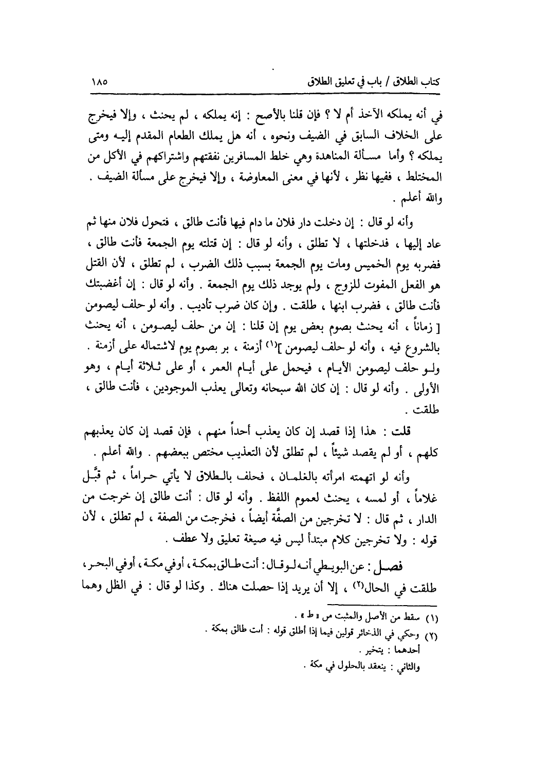 في أنه يملكه الآخذ أم لا ؟ فإن قلنا بالاصح: إنه يملكه، لم يحنث، وإلا فيخرج على الخلاف السابق في الضيف ونحوه، أنه هل يملك الطعام المقدم إليه ومتى يملكه ؟ وأما مسألة المناهدة وهي خلط المسافرين نفقتهم واشتراكهم في الاكل من المختلط، ففيها نظر، لانها في معنى المعاوضة، وإلا فيخرج على مسألة الضيف. والله أعلم. وأنه لو قال: إن دخلت دار فلان ما دام فيها فأنت طالق، فتحول فلان منها ثم عاد إليها، فدخلتها، لا تطلق، وأنه لو قال: إن قتلته يوم الجمعة فأنت طالق، فضربه يوم الخميس ومات يوم الجمعة بسبب ذلك الضرب، لم تطلق، لان القتل هو الفعل المفوت للروح، ولم يوجد ذلك يوم الجمعة. وأنه لو قال: إن أغضبتك فأنت طالق، فضرب ابنها، طلقت وإن كان ضرب تأديب. وأنه لو حلف ليصومن (زمانا، أنه يحنث بصوم بعض يوم إن قلنا: إن من حلف ليصومن، أنه يحنث بالشروع فيه، وأنه لو حلف ليصومن) أزمنة، بر بصوم يوم لاشتماله على أزمنة. ولو حلف ليصومن الايام، فيحمل على أيام العمر، أو على ثلاثة أيام، وهو الاولى. وأنه لو قال: إن كان الله سبحانه وتعالى يعذب الموجودين، فأنت طالق، طلقت. قلت: هذا إذا قصد إن كان يعذب أحدا منهم، فإن قصد إن كان يعذبهم كلهم، أو لم يقصد شيئا، لم تطلق لان التعذيب مختص ببعضهم. والله أعلم. وأنه لو اتهمته امرأته بالغلمان، فحلف بالطلاق لا يأتي حراما، ثم قبل غلاما، أو لمسه، يحنث لعموم اللفظ. وأنه لو قال: أنت طالق إن خرجت من الدار، ثم قال: لا تخرجين من الصفة أيضا، فخرجت من الصفة، لم تطلق، لان قوله: ولا تخرجين كلام مبتدأ ليس فيه صيغة تعليق ولا عطف. فصل عن البويطي أنه لو قال: أنت طالق بمكة، أو في مكة، أو في البحر، طلقت في الحال، إلا أن يريد إذا حصلت هناك. وكذا لو قال: في الظل وهما
