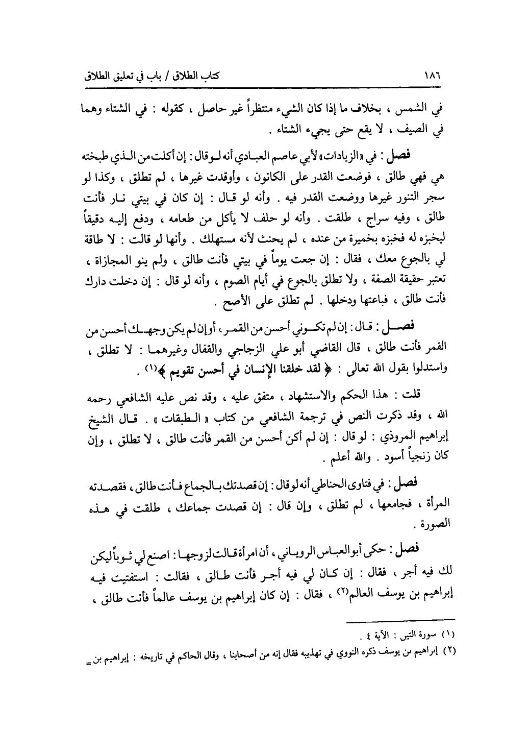 في الشمس، بخلاف ما إذا كان الشئ منتظرا غير حاصل، كقوله: في الشتاء وهما في الصيف، لا يقع حتى يجئ الشتاء. فصل في الزيادات لابي عاصم العبادي أنه لو قال: إن أكلت من الذي طبخته هي فهي طالق، فوضعت القدر على الكانون، وأوقدت غيرها، لم تطلق، وكذا لو سجر التنور غيرها ووضعت القدر فيه. وأنه لو قال: إن كان في بيتي نار فأنت طالق، وفيه سراج، طلقت وأنه لو حلف لا يأكل من طعامه، ودفع إليه دقيقا ليخبزه له فخبزه بخميرة من عنده، لم يحنث لانه مستهلك. وأنها لو قالت: لا طاقة لي بالجوع معك، فقال: إن جعت يوما في بيتي فأنت طالق، ولم ينو المجازاة، تعتبر حقيقة الصفة، ولا تطلق بالجوع في أيام الصوم، وأنه لو قال: إن دخلت دارك فأنت طالق، فباعتها ودخلها، لم تطلق على الاصح. فصل قال: إن لم تكوني أحسن من القمر، أو إن لم يكن وجهك أحسن من القمر فأنت طالق، قال القاضي أبو علي الزجاجي والقفال وغيرهما: لا تطلق، واستدلوا بقول الله تعالى: * (لقد خلقنا الانسان في أحسن تقويم) *. قلت: هذا الحكم والاستشهاد، متفق عليه، وقد نص عليه الشافعي رحمه الله، وقد ذكرت النص في ترجمة الشافعي من كتاب الطبقات. قال الشيخ إبرهيم المروذي: لو قال: إن لم أكن أحسن من القمر فأنت طالق، لا تطلق، وإن كان زنجيا أسود. والله أعلم. فصل في فتاوى الحناطي أنه لو قال: إن قصدتك بالجماع فأنت طالق، فقصدته المرأة، فجامعها، لم تطلق، وإن قال: إن قصدت جماعك، طلقت في هذه الصورة. فصل حكى أبو العباس الروياني، أن امرأة قالت لزوجها: اصنع لي ثوبا ليكن لك فيه أجر، فقال: إن كان لي فيه أجر فأنت طالق، فقالت: استفتيت فيه إبرهيم بن يوسف العالم، فقال: إن كان إبرهيم بن يوسف عالما فأنت طالق،