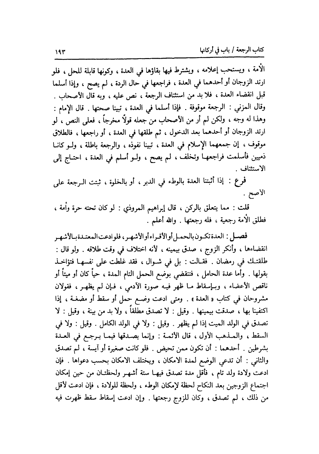 الامة، ويستحب إعلامه، ويشترط فيها بقاؤها في العدة، وكونها قابلة للحل، فلو ارتد الزوجان أو أحدهما في العدة، فراجعها في حال الردة، لم يصح، وإذا أسلما قبل انقضاء العدة، فلا بد من استئناف الرجعة، نص عليه، وبه قال الاصحاب. وقال المزني: الرجعة موقوفة. فإذا أسلما في العدة، تبينا صحتها. قال الامام: وهذا له وجه، ولكن لم أر من الاصحاب من جعله قولا مخرجا، فعلى النص، لو ارتد الزوجان أو أحدهما بعد الدخول، ثم طلقها في العدة، أو راجعها، فالطلاق موقوف، إن جمعهما الاسلام في العدة، تبينا نفوذه، والرجعة باطلة، ولو كا نا ذميين فأسلمت فراجعها وتخلف، لم يصح، ولو أسلم في العدة، احتاج إلى الاستئناف. فرع إذا أثبتنا العدة بالوطئ في الدبر، أو بالخلوة، ثبتت الرجعة على الاصح. قلت: مما يتعلق بالركن، قال إبرهيم المروذي: لو كان تحته حرة وأمة، فطلق الامة رجعية، فله رجعتها. والله أعلم.