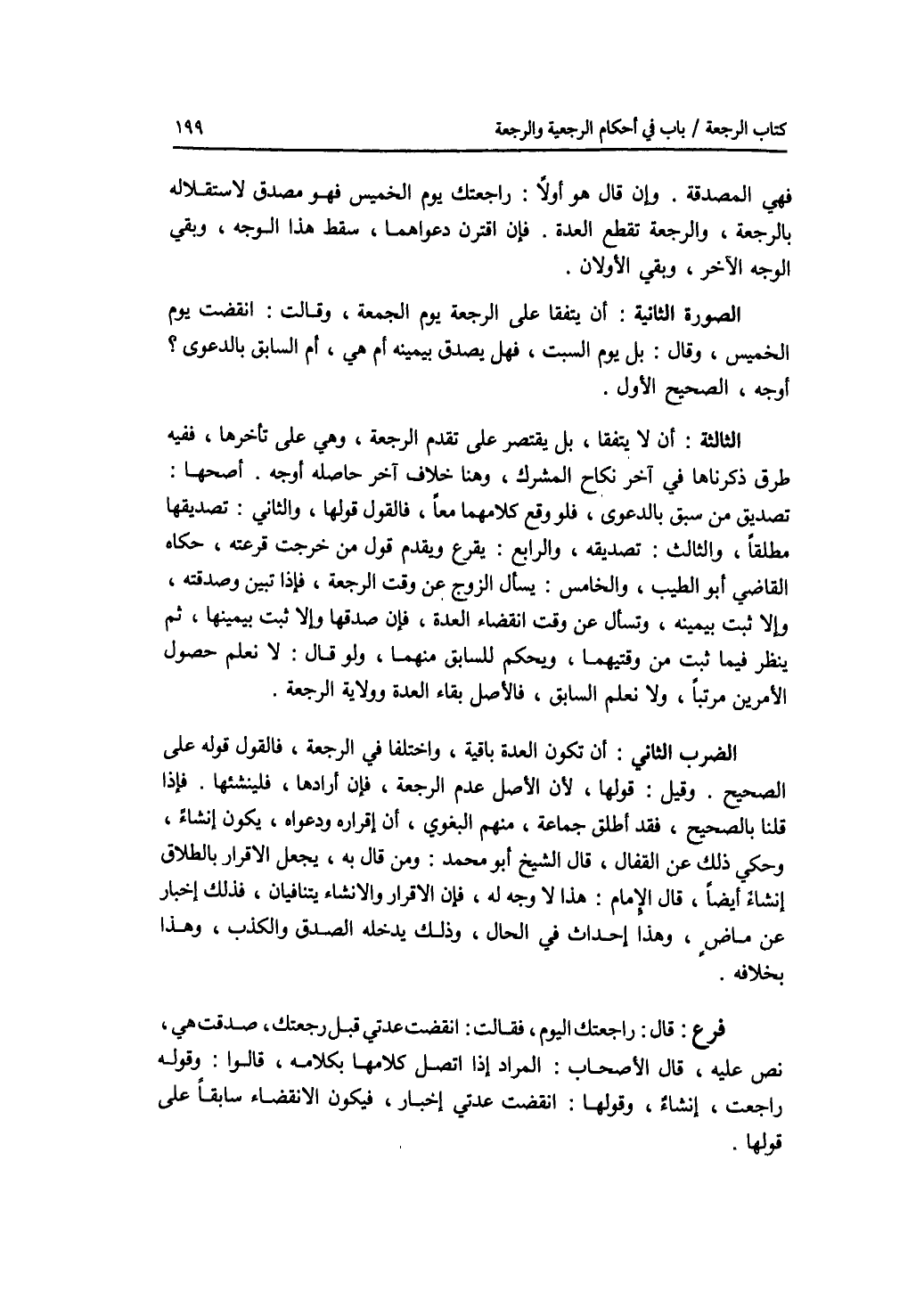 فهي المصدقة. وإن قال هو أولا: راجعتك يوم الخميس فهو مصدق لاستقلاله بالرجعة، والرجعة تقطع العدة. فإن اقترن دعواهما، سقط هذا الوجه، وبقي الوجه الآخر، وبقي الاولان. الصورة الثانية: أن يتفقا على الرجعة يوم الجمعة، وقالت: انقضت يوم الخميس، وقال: بل يوم السبت، فهل يصدق بيمينه أم هي، أم السابق بالدعوى ؟ أوجه، الصحيح الاول. الثالثة: أن لا يتفقا، بل يقتصر على تقدم الرجعة، وهي على تأخرها، ففيه طرق ذكرناها في اخر نكاح المشرك، وهنا خلاف اخر حاصله أوجه. أصحها: تصديق من سبق بالدعوى، فلو وقع كلامهما معا، فالقول قولها، والثاني: تصديقها مطلقا، والثالث: تصديقه، والرابع: يقرع ويقدم قول من خرجت قرعته، حكاه القاضي أبو الطيب، والخامس: يسأل الزوج عن وقت الرجعة، فإذا تبين وصدقته، وإلا ثبت بيمينه، وتسأل عن وقت انقضاء العدة، فإن صدقها وإلا ثبت بيمينها، ثم ينظر فيما ثبت من وقتيهما، ويحكم للسابق منهما، ولو قال: لا نعلم حصول الامرين مرتبا، ولا نعلم السابق، فالاصل بقاء العدة وولاية الرجعة. الضرب الثاني: أن تكون العدة باقية، واختلفا في الرجعة، فالقول قوله على الصحيح. وقيل: قولها، لان الاصل عدم الرجعة، فإن أرادها، فلينشئها. فإذا قلنا بالصحيح، فقد أطلق جماعة، منهم البغوي، أن إقراره ودعواه، يكون إنشاء، وحكى ذلك عن القفال، قال الشيخ أبو محمد: ومن قال به، يجعل الاقرار بالطلاق إنشاء أيضا، قال الامام: هذا لا وجه له، فإن الاقرار والانشاء يتنافيان، فذلك إخبار عن ماض، وهذا إحداث في الحال، وذلك يدخله الصدق والكذب، وهذا بخلافه. فرع قال: راجعتك اليوم، فقالت: انقضت عدتي قبل رجعتك، صدقت هي، نص عليه، قال الاصحاب: المراد إذا اتصل كلامها بكلامه، قالوا: وقوله راجعت، إنشاء، وقولها: انقضت عدتي إخبار، فيكون الانقضاء سابقا على قولها.