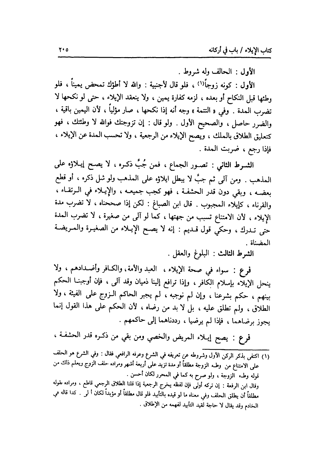 الأول : الحالف وله شروط. الاول: كونه زوجا، فلو قال لاجنبية: والله لا أطؤك تمحض يمينا فلو وطئها قبل النكاح أو بعده، لزمه كفارة يمين، ولا ينعقد الايلاء، حتى لو نكحها لا تضرب المدة. وفي التتمة وجه أنه إذا نكحها، صار مؤليا، لان اليمين باقية، والضرر حاصل، والصحيح الاول. ولو قال: إن تزوجتك فوالله لا وطئتك، فهو كتعليق الطلاق بالملك، ويصح الايلاء من الرجعية، ولا تحسب المدة عن الايلاء، فإذا رجع، ضربت المدة. الشرط الثاني: تصور الجماع، فمن جب ذكره، لا يصح إيلاؤه على المذهب. ومن آلى ثم جب، لا يبطل إيلاؤه على المذهب. ولو شل ذكره، أو قطع بعضه، وبقي دون قدر الحشفة، فهو كجب جميعه، والايلاء في الرتقاء، والقرناء، كإيلاء المجبوب. قال ابن الصباغ: لكن إذا صححناه، لا تضرب مدة الايلاء، لان الامتناع تسبب من جهتها، كما لو آلى من صغيرة، لا تضرب المدة حتى تدرك، وحكي قول قديم: أنه لا يصح الايلاء من الصغيرة والمريضة المضناة. الشرط الثالث: البلوغ والعقل. فرع سواء في صحة الايلاء، العبد والامة، والكافر وأضدادهم، ولا ينحل الايلاء بإسلام الكافر، وإذا ترافع إلينا ذميان وقد آلى، فإن أوجبنا الحكم بينهم، حكم بشرعنا، وإن لم نوجبه، لم يجبر الحاكم الزوج على الفيئة، ولا الطلاق، ولم تطلق عليه، بل لا بد من رضاه، لان الحكم على هذا القول إنما يجوز برضاهما، فإذا لم يرضيا، رددناهما إلى حاكمهم. فرع يصح إيلاء المريض والخصي، ومن بقي من ذكره قدر الحشفة،