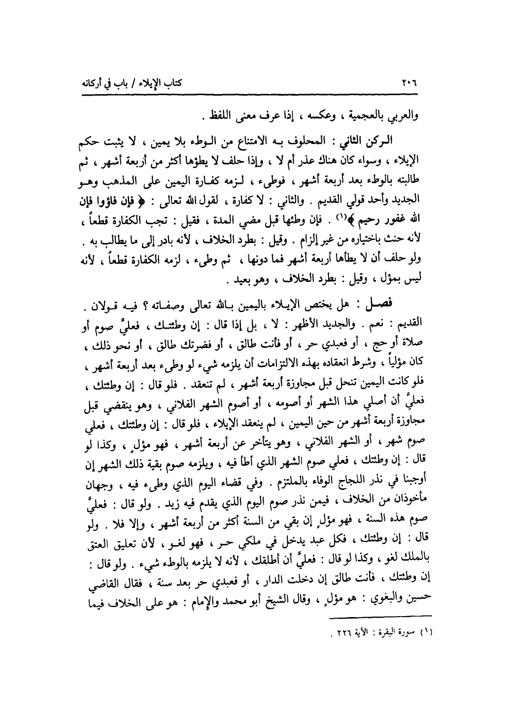 الركن الثاني : المحلوف به الامتناع من الوطئ بلا يمين، لا يثبت حكم الايلاء، وسواء كان هناك عذر أم لا، وإذا حلف لا يطؤها أكثر من أربعة أشهر، ثم طالبته بالوطئ بعد أربعة أشهر، فوطئ، لزمه كفارة اليمين على المذهب وهو الجديد وأحد قولي القديم. والثاني: لا كفارة، لقول الله تعالى: * (فإن فاؤوا فإن الله غفور رحيم) *. فإن وطئها قبل مضي المدة، فقيل: تجب الكفارة قطعا، لانه حنث باختياره من غير إلزام. وقيل: بطرد الخلاف، لانه بادر إلى ما يطالب به. ولو حلف أن لا يطأها أربعة أشهر فما دونها، ثم وطئ، لزمه الكفارة قطعا، لانه ليس بمؤل، وقيل: بطرد الخلاف، وهو بعيد. فصل هل يختص الايلاء باليمين بالله تعالى وصفاته ؟ فيه قولان. القديم: نعم. والجديد الاظهر: لا، بل إذا قال: إن وطئتك، فعلي صوم أو صلاة أو حج، أو فعبدي حر، أو فأنت طالق، أو فضرتك طالق، أو نحو ذلك، كان مؤليا، وشرط انعقاده بهذه الالتزامات أن يلزمه شئ لو وطئ بعد أربعة أشهر، فلو كانت اليمين تنحل قبل مجاوزة أربعة أشهر، لم تنعقد. فلو قال: إن وطئتك، فعلي أن أصلي هذا الشهر أو اصومه أو أصوم الشهر الفلاني، وهو ينقضي قبل مجاوزة أربعة أشهر من حين اليمين، لم ينعقد الايلاء، فلو قال: إن وطئتك، فعلي صوم شهر، أو الشهر الفلاني، وهو يتأخر عن أربعة أشهر، فهو مؤل، وكذا لو قال: إن وطئتك، فعلي صوم الشهر الذي أطأ فيه، ويلزمه صوم بقية ذلك الشهر إن أوجبنا في نذر اللجاج الوفاء بالملتزم. وفي قضاء اليوم الذي وطئ فيه، وجهان مأخوذان من الخلاف، فيمن نذر صوم اليوم الذي يقدم فيه زيد. ولو قال: فعلي صوم هذه السنة، فهو مؤل إن بقي من السنة أكثر من أربعة أشهر، وإلا فلا. ولو قال: إن وطئتك، فكل عبد يدخل في ملكي حر، فهو لغو، لان تعليق العتق بالملك لغو، وكذا لو قال: فعلي أن أطلقك، لانه لا يلزمه بالوطئ شئ. ولو قال: إن وطئتك، فأنت طالق إن دخلت الدار، أو فعبدي حر بعد سنة، فقال القاضي حسين والبغوي: هو مؤل، وقال الشيخ أبو محمد والامام: هو على الخلاف فيما